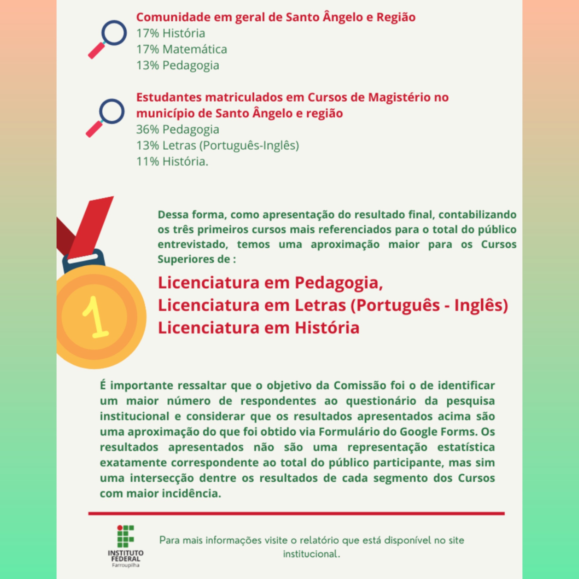Foram alcançadas mais de 1.600 respostas, indicando os três primeiros cursos mais referenciados para o total do público pesquisado. Dentre os Cursos Superiores de Licenciatura mais votados, considerados os segmentos consultados, ficaram respectivamente os Cursos de Pedagogia, Letras (Português-Inglês) e História. (conforme ilustrado no infográfico abaixo).