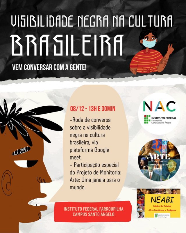 Hoje às 13h30min, tem bate papo com o NEABI do IFFAR Campus Santo Ângelo sobre a Cultura Negra!! Via Google Meet