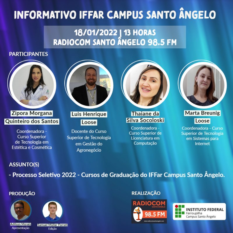 Nesta terça-feira (18/01/2022) às 13h, acompanhe AO VIVO o Informativo do IFFar SAN no seu rádio (98.5 FM), celular ou computador, através da RADIOCOM Santo Ângelo e das redes do Campus.