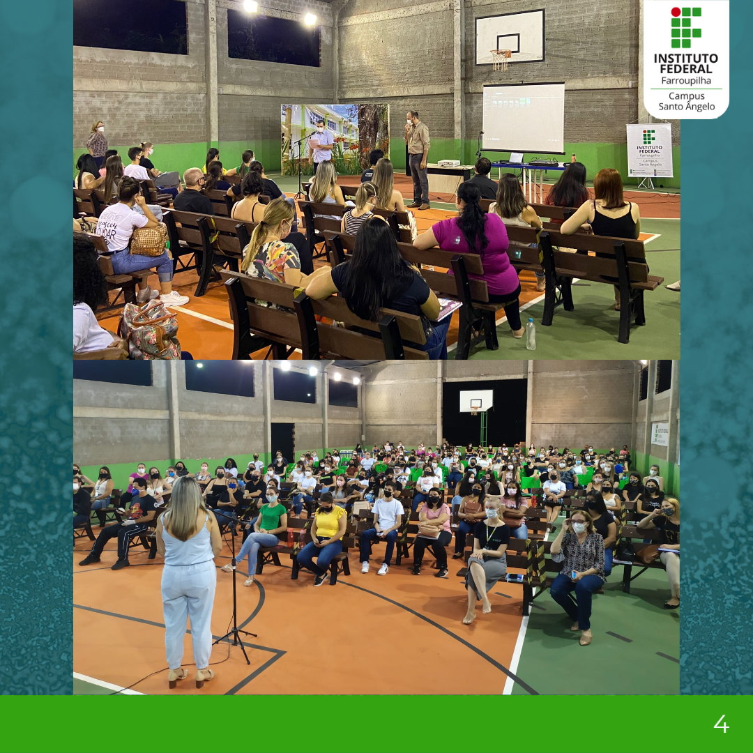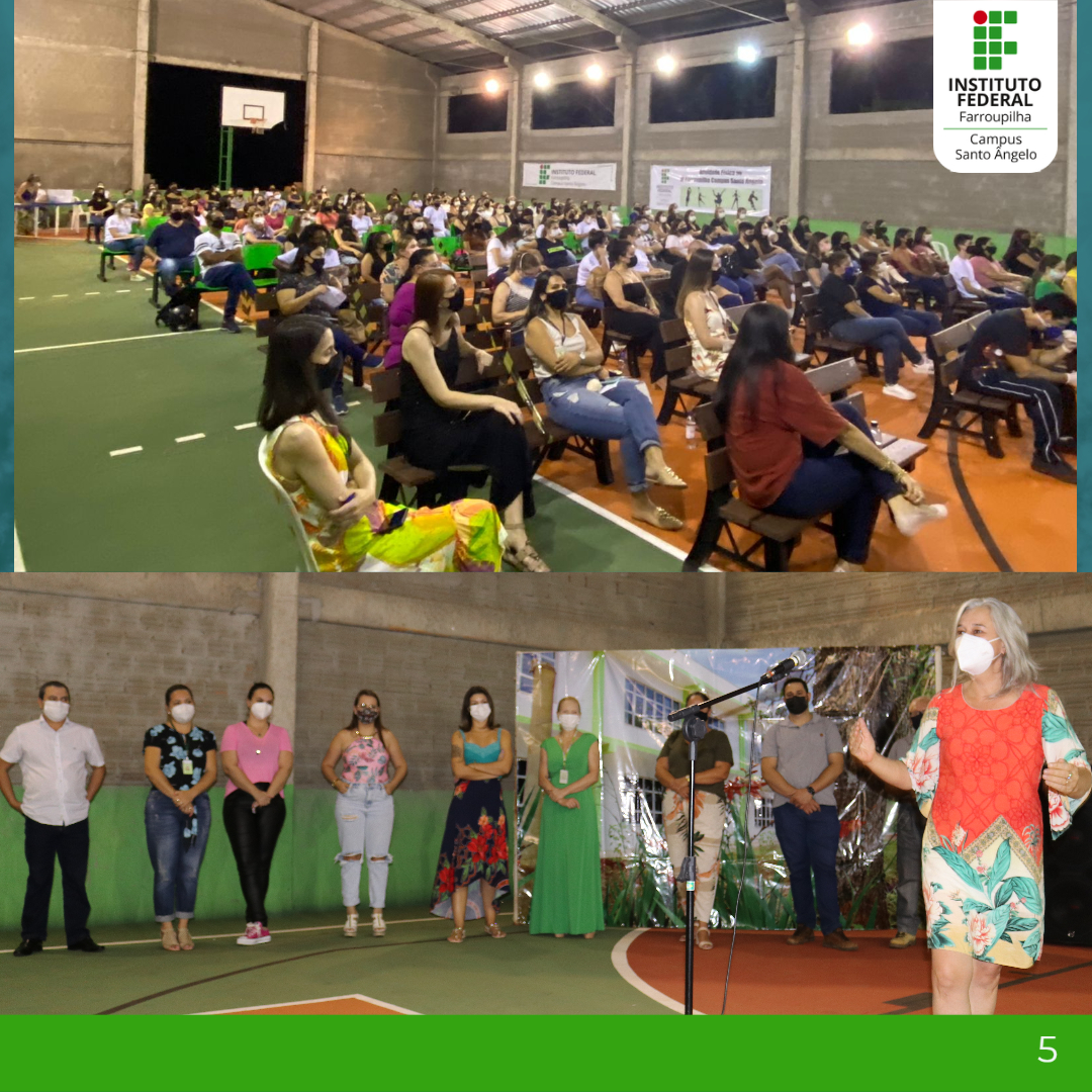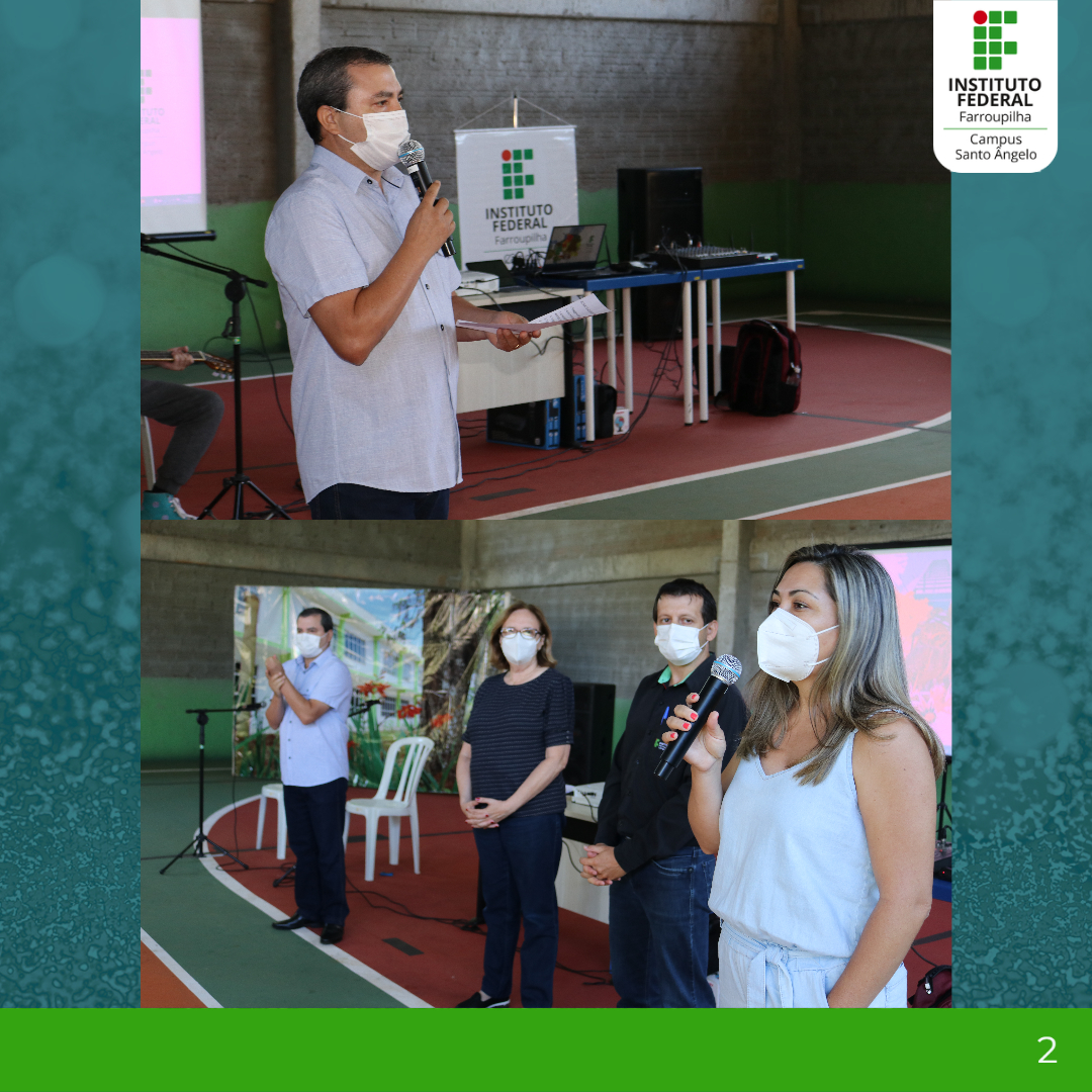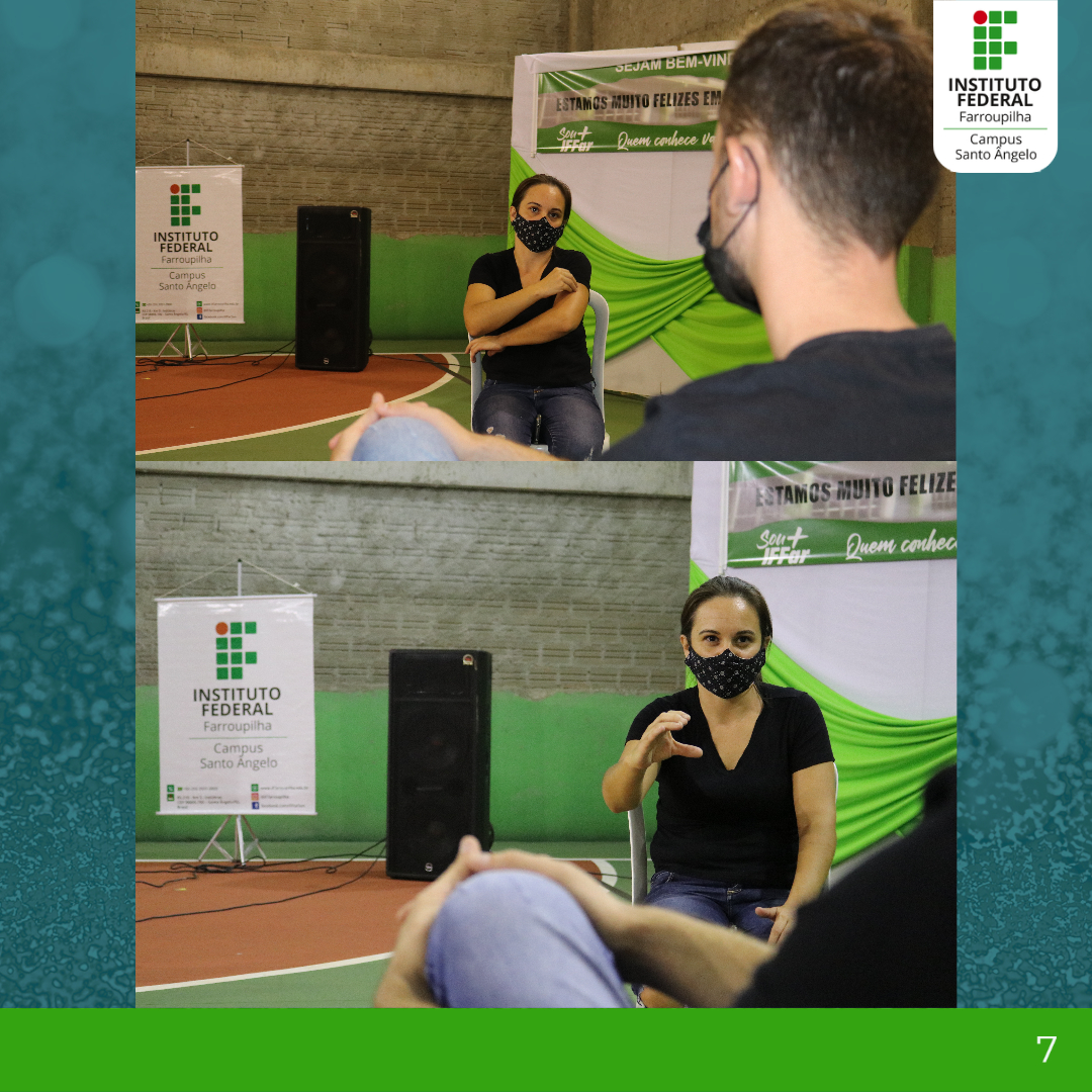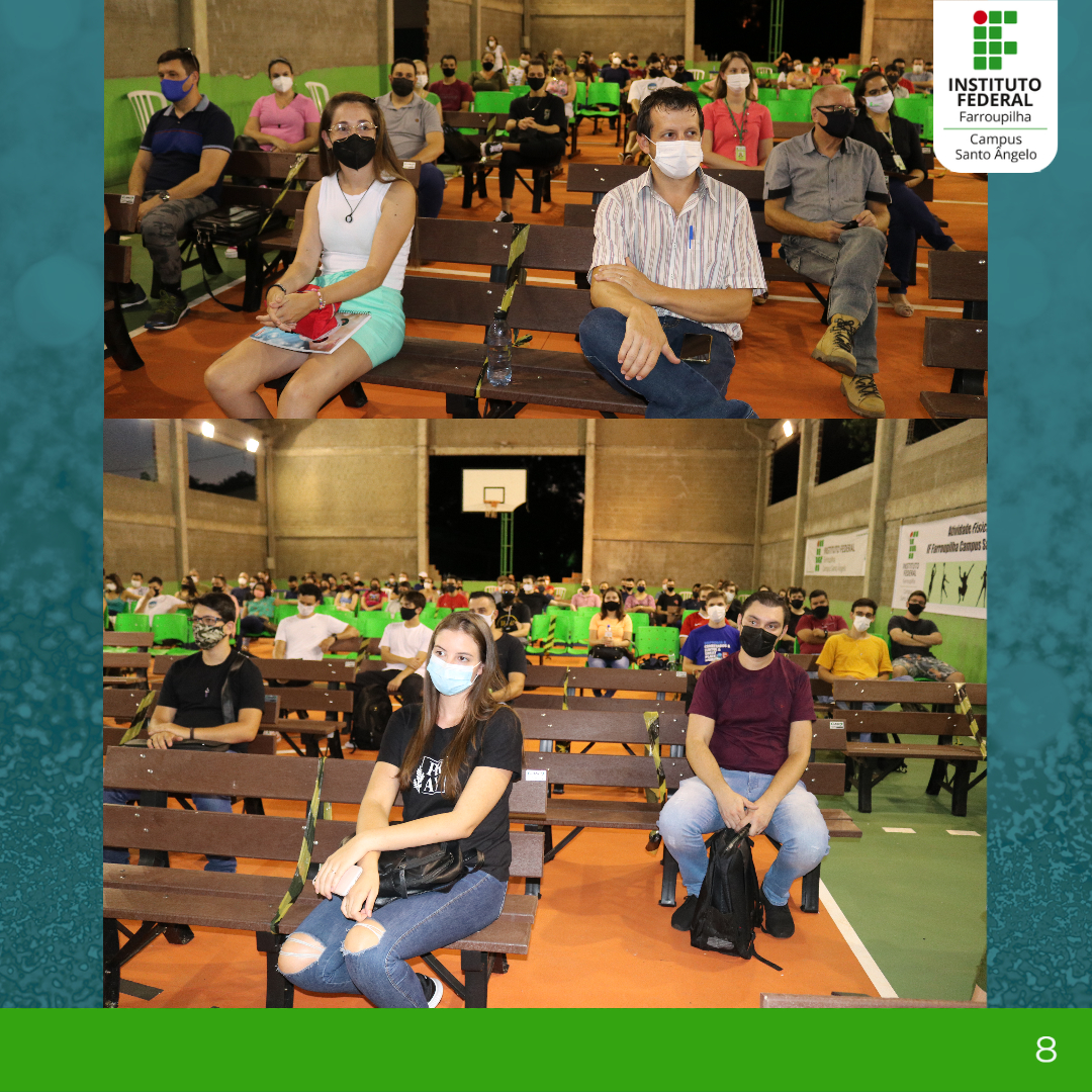 A programação, em todos os períodos de acolhimento, foi organizada em dois momentos: (1) Inicialmente, nas dependências da quadra de esportes coberta, realizou-se apresentações artísticas organizada pelo Núcleo de Arte e Cultura (NAC); mensagem de boas-vindas pela reitora do IFFar, equipe diretiva e servidores do Campus; apresentação de vídeo institucional do Campus e orientações sobre os protocolos de segurança sanitária para o retorno presencial pela equipe de saúde. (2) Em seguida, em locais distintos, cada coordenação de curso dirigiu um diálogo preliminar sobre o curso e visita guiada para conhecer os espaços pedagógicos e setores do Campus.
