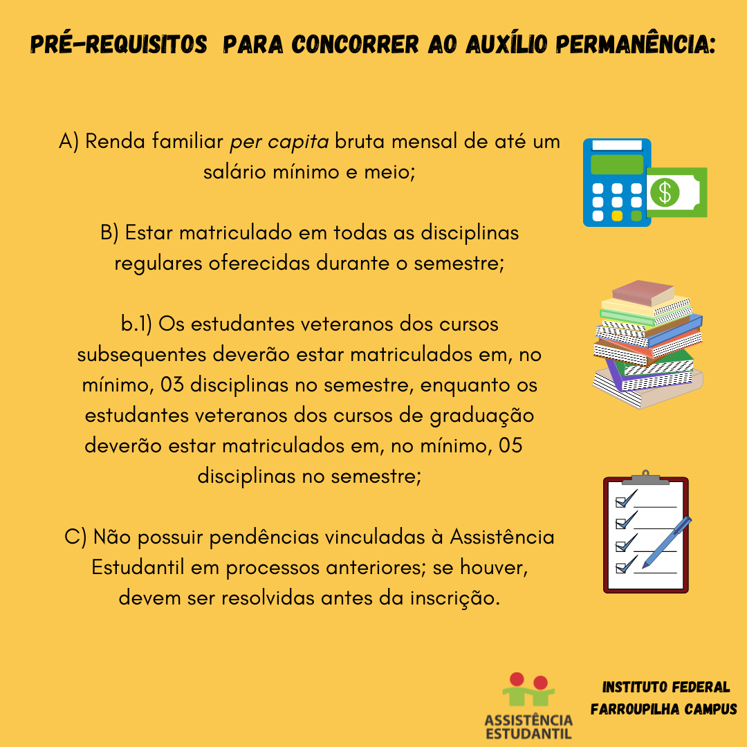 Podem participar alunos de cursos presenciais do IFFar que tenham renda familiar per capita bruta mensal de até um salário mínimo e meio. Também é preciso estar matriculado em todas as disciplinas regulares oferecidas durante o semestre. De acordo com o edital, a distribuição dos valores do Auxílio Permanência está atrelada ao limite orçamentário destinado a este fim.