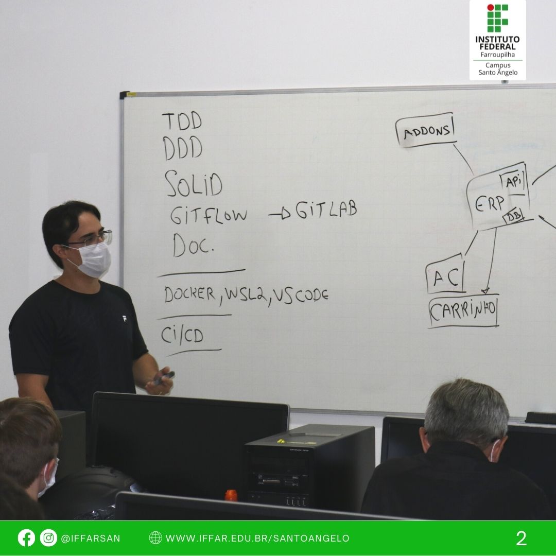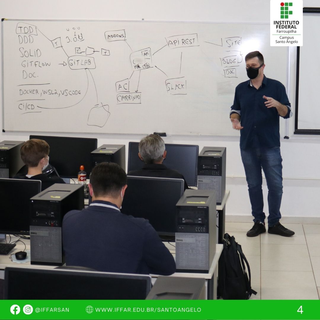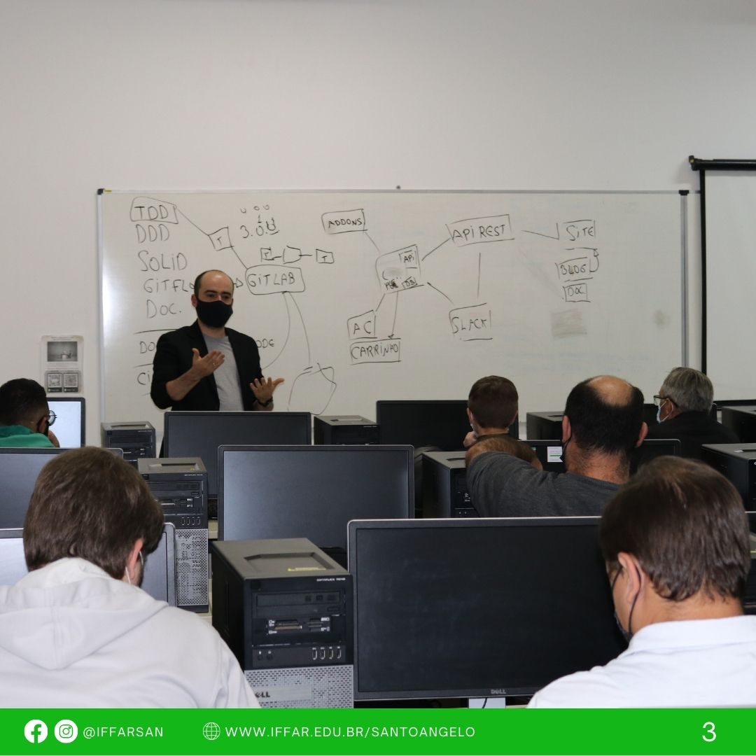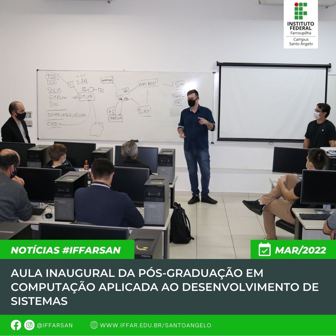No dia 25 de março, nas dependências do Instituto Federal Farroupilha - Campus Santo Ângelo, aconteceu a Aula Inaugural da Pós-Graduação em Computação Aplicada ao Desenvolvimento de Sistemas, com as falas dos convidados: Fernando Manchini de Souza - Coordenador de Desenvolvimento da Mérito, Kelven Garcia Campos - Analista de Sistemas da San Internet e Vinícius Stumpf - Gerente de Desenvolvimento da Solution Sistemas e Gestão, sobre as tendências no desenvolvimento de Software.