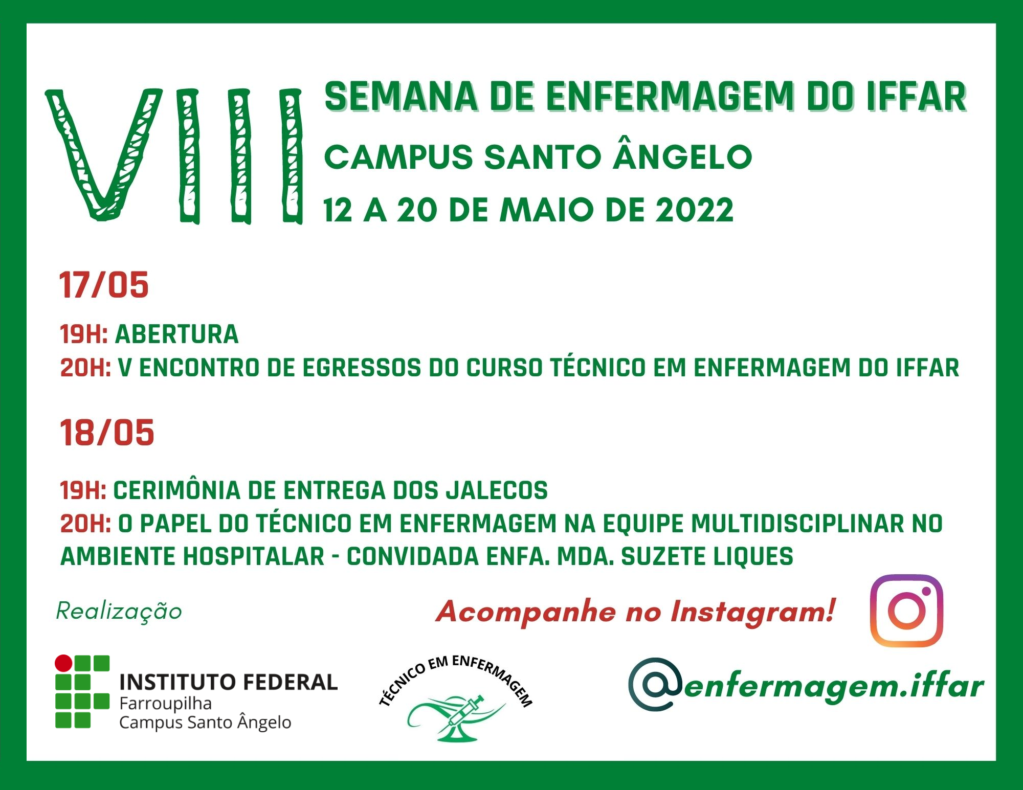 O Curso Técnico em Enfermagem do IFFar Campus Santo Ângelo promoverá a Semana de Enfermagem nos dias 17 e 18 de maio.