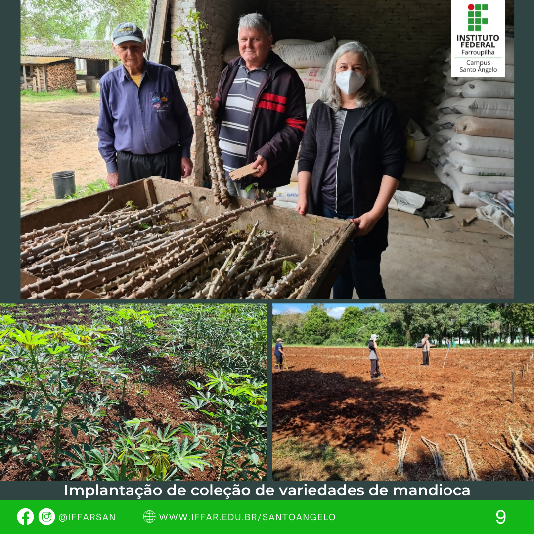 Além disso, realizou-se a implantação de área demonstrativa de variedades de mandioca (convencionais e biofortificadas), para avaliar sua produção e adaptação, proporcionando conhecimento sobre as diferentes variedades, alimentação e renda aos agricultores do município de Santo Ângelo e região, aliando ao projeto Ensino, Pesquisa e Extensão.