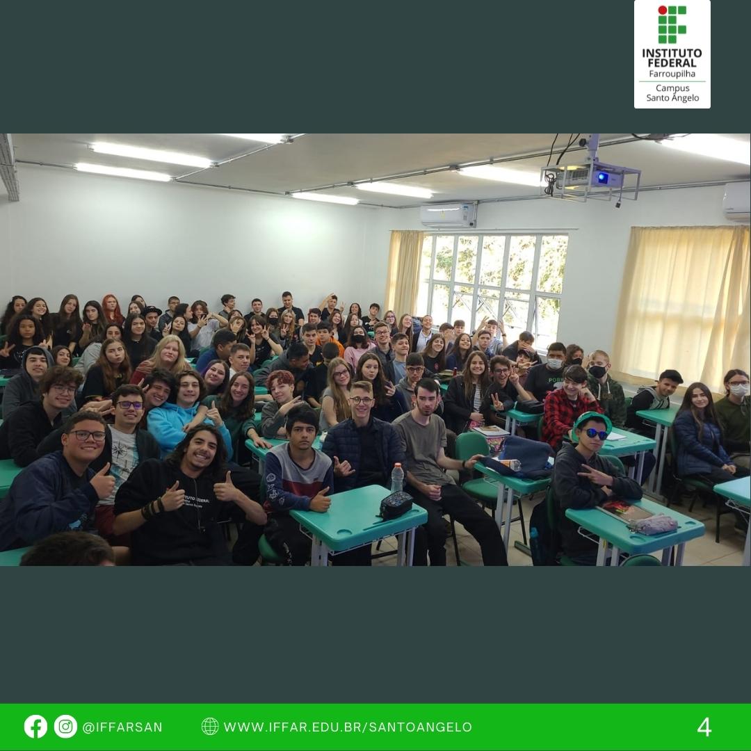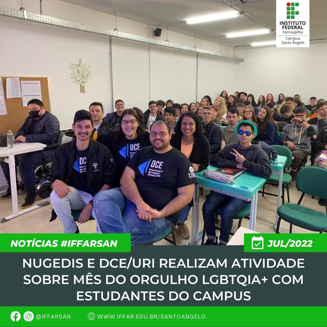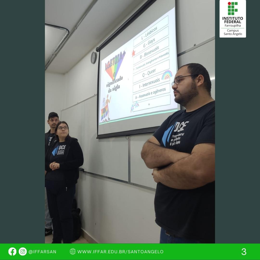 No dia 04 de julho, os estudantes Ramão Miranda, Gabriela Mortoza, Varlei da Rosa e Geovana Fonseca, integrantes do Diretório Central dos Estudantes (DCE) da URI Santo Ângelo, realizaram a atividade "Mês do Orgulho LGBTQIA: Debatendo Gênero e Direitos" com os estudantes dos cursos técnicos integrados em Administração (ADM11) e Manutenção e Suporte em Informática (MSI21 e MSI31).