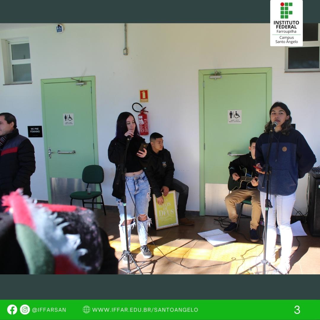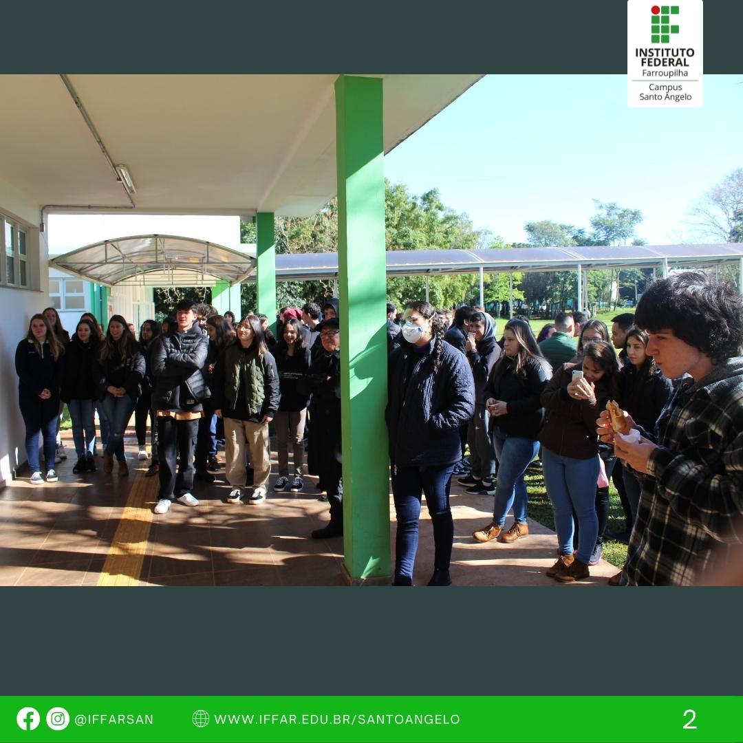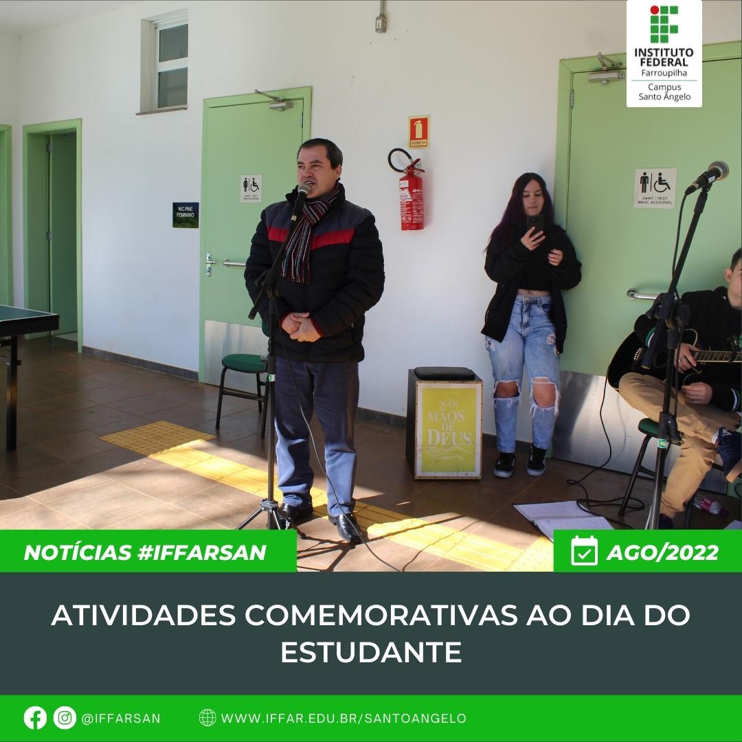 Dia 11 de agosto comemora-se o Dia do Estudante. Para marcar essa data, o IFFar - Campus Santo Ângelo desenvolveu uma atividade singela, mas com muito carinho. Pela manhã, a programação contou com lanche especial para o Dia do Estudante, para os cursos integrados diurnos, além de homenagem com mensagem pela Direção Geral, apresentação musical pelos alunos, Jenifer Souza, Renan Prestes, Luiz Otávio e Brenda.