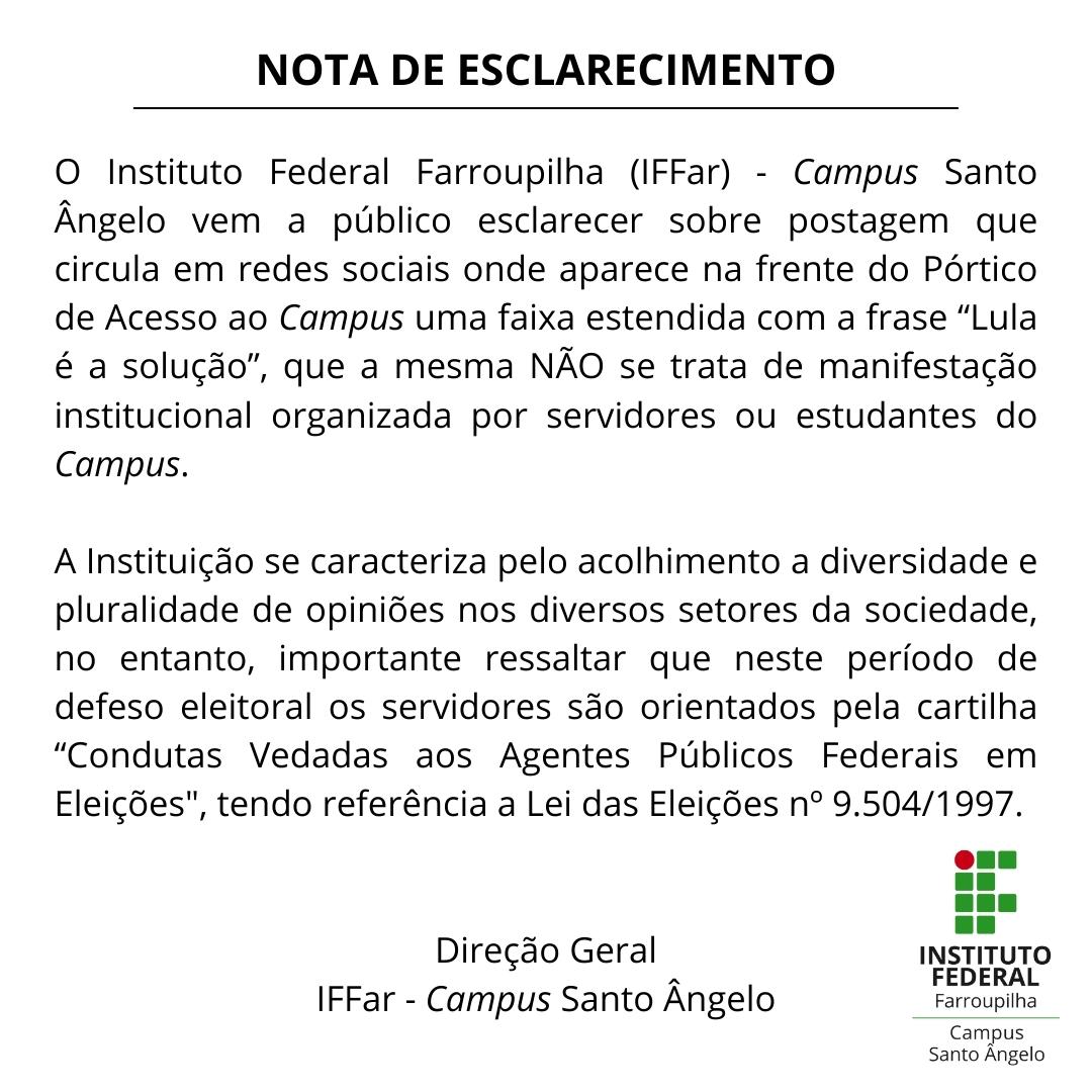 O Instituto Federal Farroupilha (IFFar) - Campus Santo Ângelo vem a público esclarecer sobre postagem que circula em redes sociais onde aparece na frente do Pórtico de Acesso ao Campus uma faixa estendida com a frase “Lula é a solução”, que a mesma NÃO se trata de manifestação institucional organizada por servidores ou estudantes do Campus.