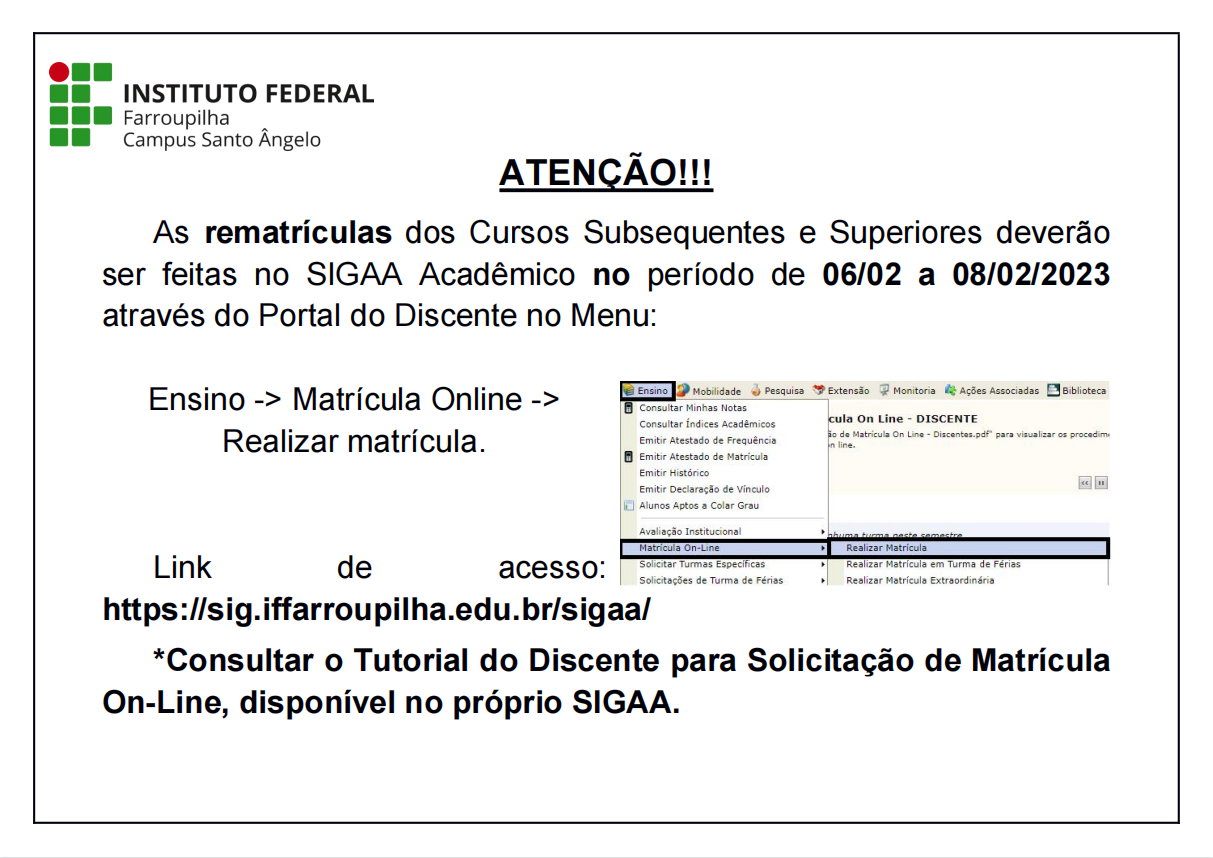 As rematrículas dos Cursos Subsequentes e Superiores deverão ser feitas no SIGAA Acadêmico no período de 06/02 a 08/02/2023 através do Portal do Discente no Menu: