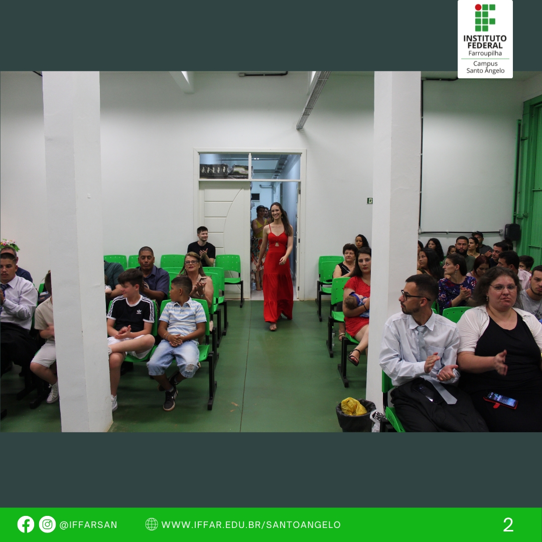 O evento aconteceu de forma presencial no auditório do Campus, contando com a presença da equipe diretiva, coordenação do curso e servidores, bem como familiares dos formandos.