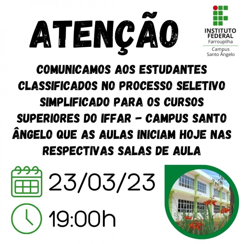 Comunicamos aos estudantes classificados no Processo Seletivo Simplificado para os Cursos Superiores do IFFar - Campus Santo Ângelo que as aulas iniciam hoje, dia 23/03/23 às 19h nas respectivas salas de aula.