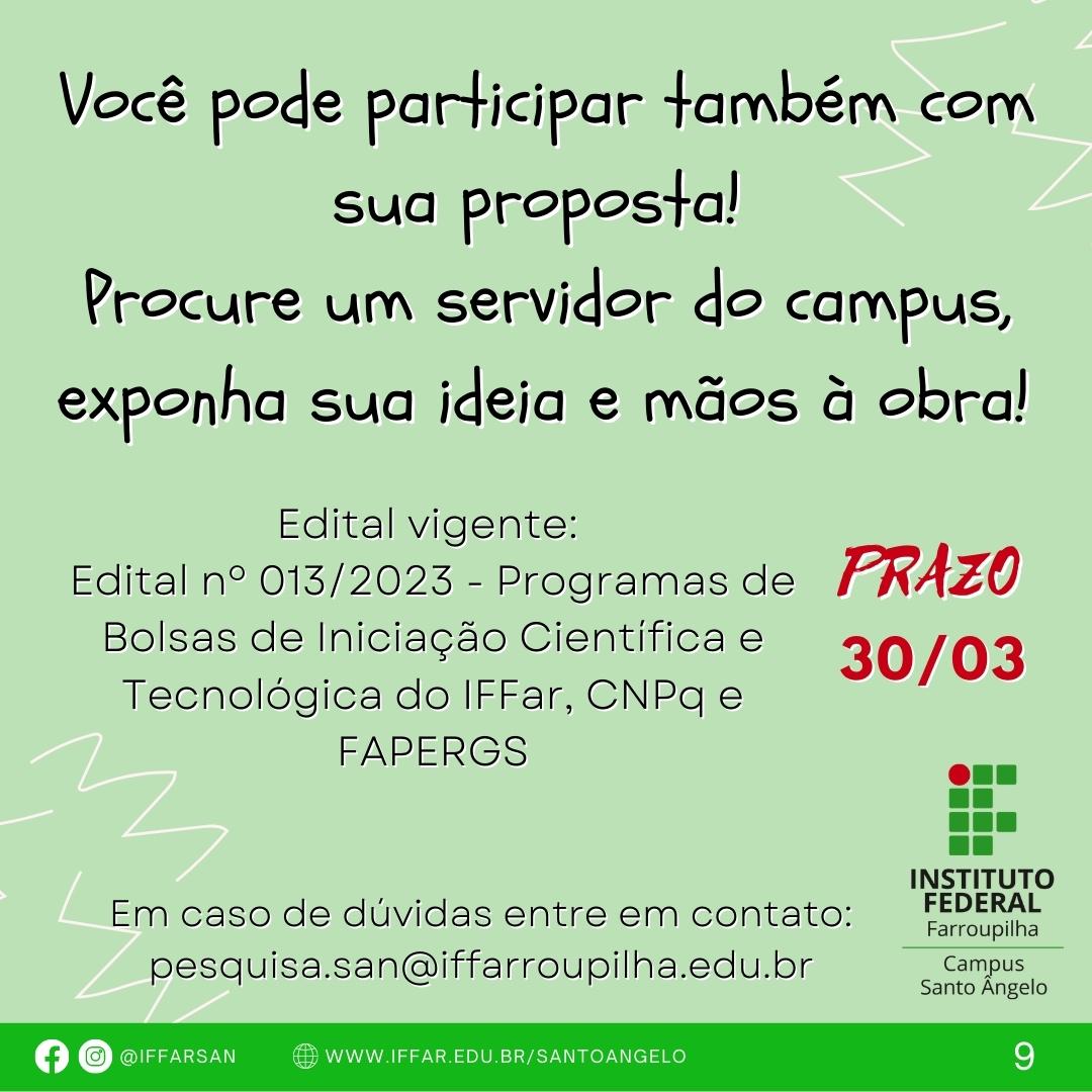 Participe e/ou venha propor suas ideias para que juntos possamos construir conhecimento, buscar respostas e soluções para questões do cotidiano de nossa comunidade e, assim, fortalecer a pesquisa no IFFar SAN!