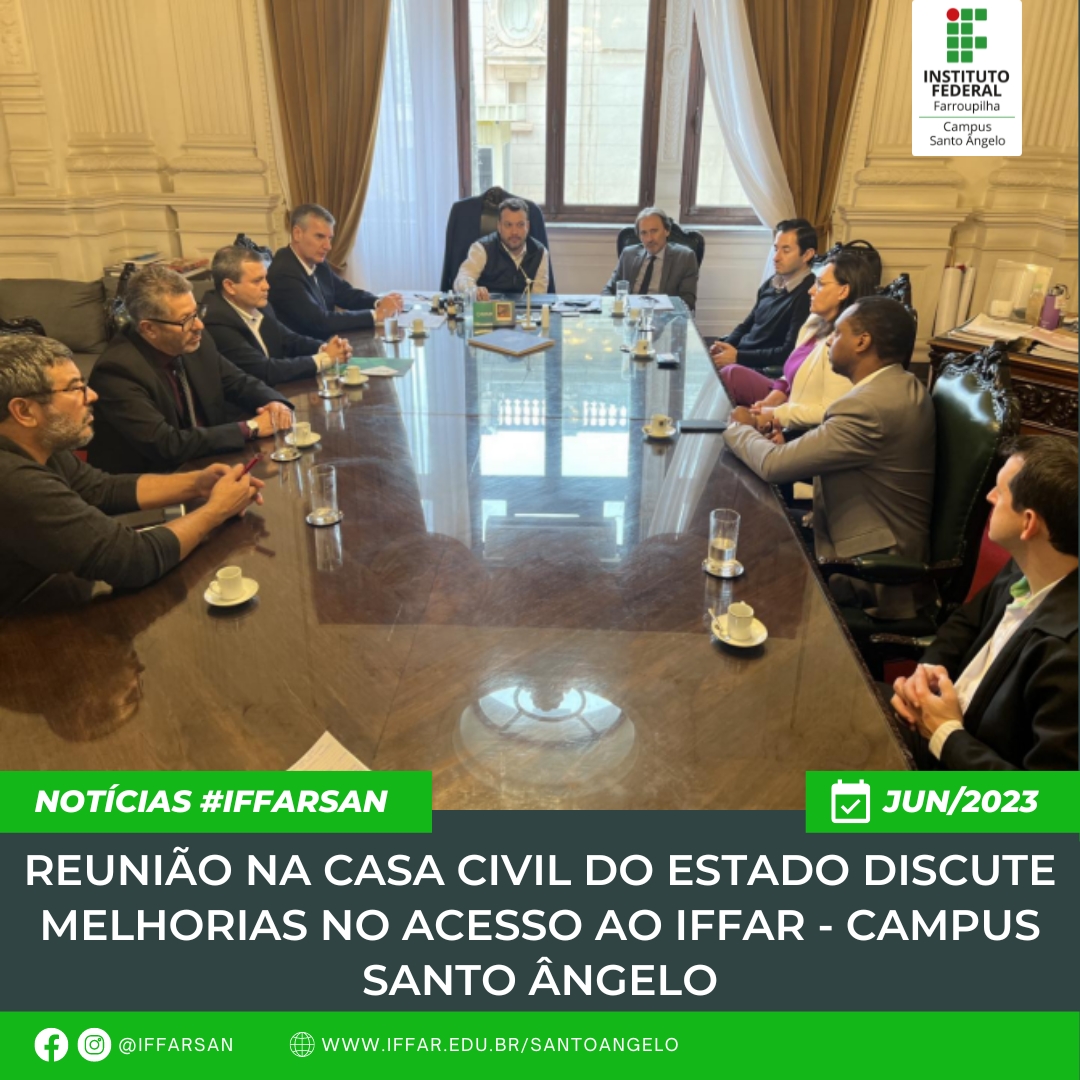 O encontro de mobilização da pauta em prol da remodelação de acesso ao Campus contou com a presença de lideranças locais e representantes do governo do Estado. Participaram da reunião com o Chefe da Casa Civil, Arthur Lemos, o Secretário Estadual de Logística e Transportes, Juvir Costela, o Diretor Geral do DAER, Luciano Faustino, o Dep. Est. Eduardo Loureiro, a Reitora do IFFar, Nídia Heringer, o Diretor Geral do IFFar - Campus Santo Ângelo, Adilson Stamberg, o Diretor de Administração do Campus, Tiago Benetti, o Secretário de Governo e Relações Institucionais de Santo Ângelo, Jânio Bones, além de representantes da Dep. Est. Laura Sito.