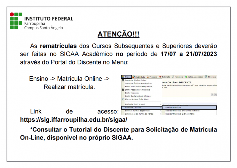 As rematrículas dos Cursos Subsequentes e Superiores deverão ser feitas no SIGAA Acadêmico no período de 17/07 a 21/07/2023 através do Portal do Discente no Menu: