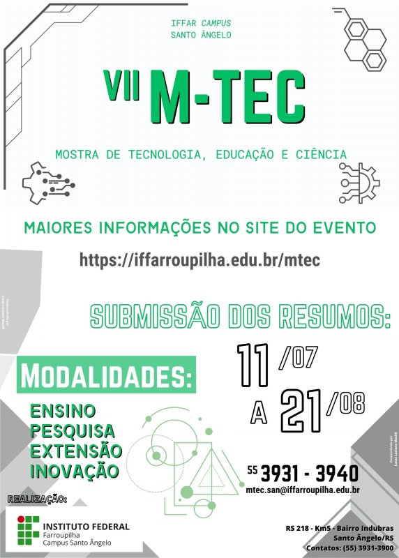 É com grande satisfação que anunciamos o lançamento da VII Mostra de Tecnologia, Educação e Ciência (VII M-TEC) do Instituto Federal de Educação, Ciência e Tecnologia Farroupilha (IFFar) Campus Santo Ângelo.