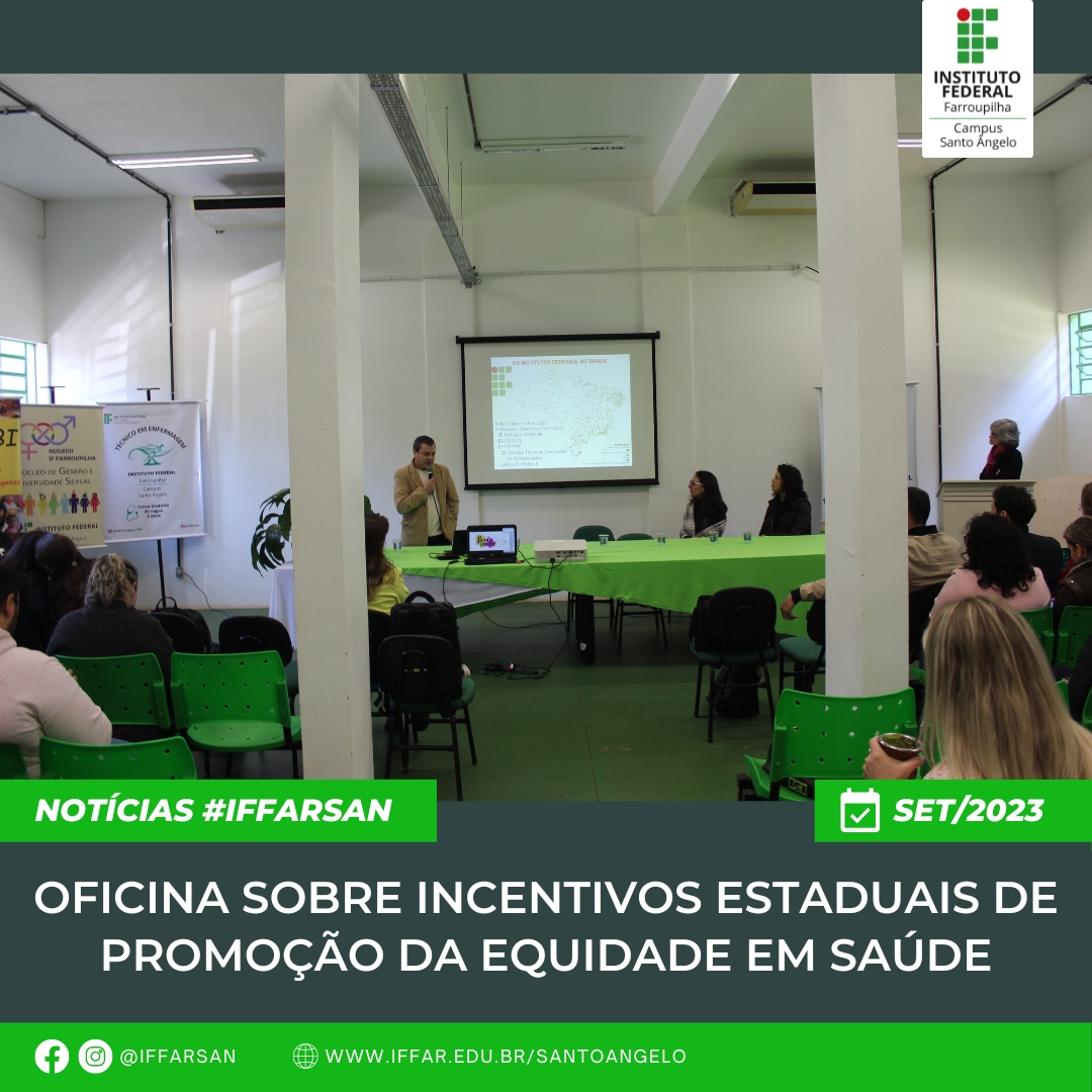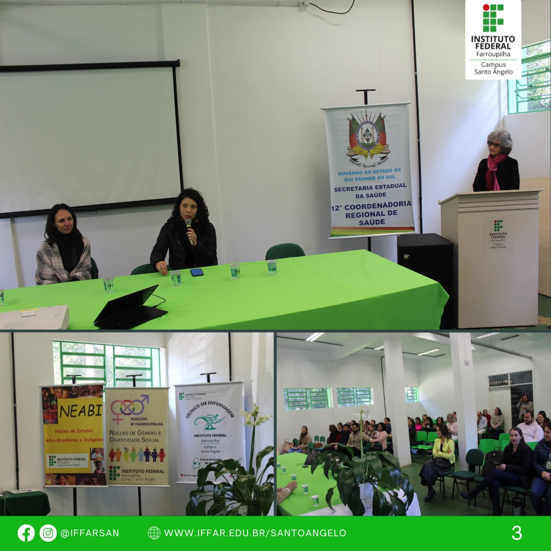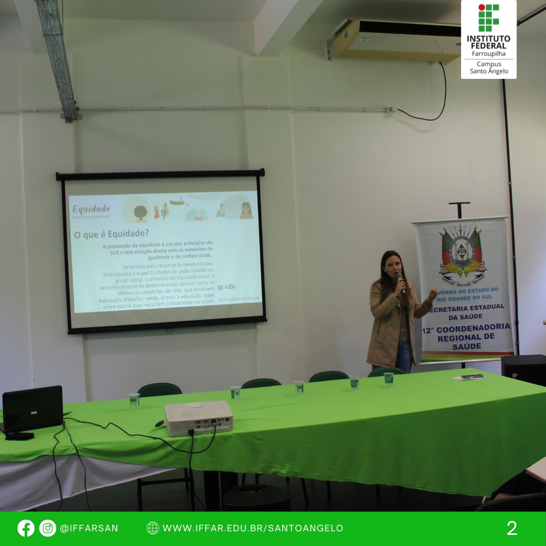 No dia 30/08, nos turnos da manhã e tarde, o IFFar Campus Santo Ângelo sediou a Oficina sobre Incentivos Estaduais de Promoção da Equidade em Saúde, evento este promovido pela 12ª Coordenadoria Regional de Saúde em parceria com a Coordenação de Ações Afirmativas (CAA), Coordenação de Apoio a Pessoas com Necessidades Especiais (CAPNE) e Coordenação do Curso Técnico em Enfermagem.