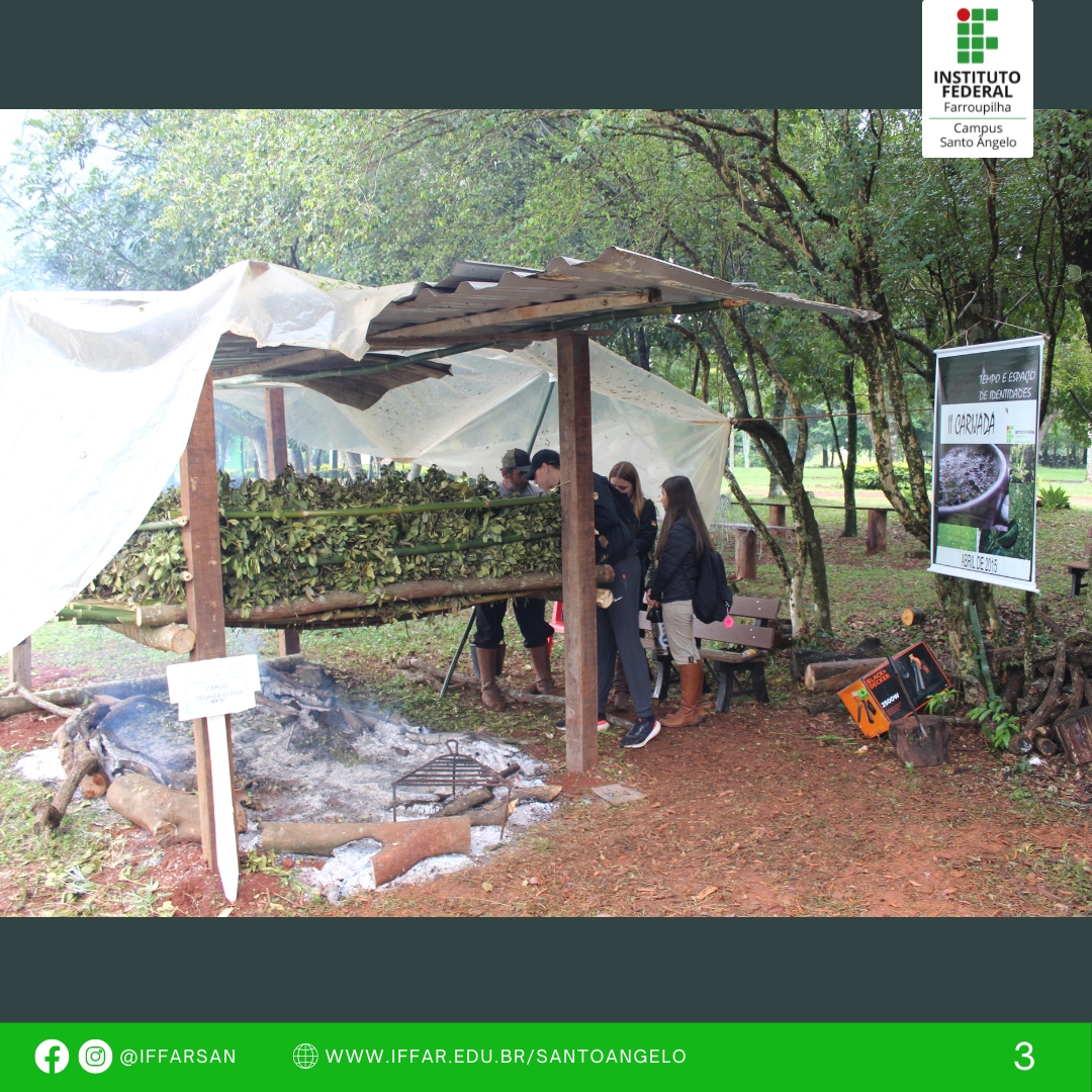 O processo de produção de erva-mate envolveu alunos do Campus e visitantes, desde a colheita da planta, o sapeco, a formação dos macacos, a secagem no carijo, o cancheamento e, por fim, a pilagem da erva e o sorver do chimarrão com a erva-mate produzida. Esses momentos são vivenciados com muita alegria por parte dos alunos, em especial dos cursos técnicos integrados.