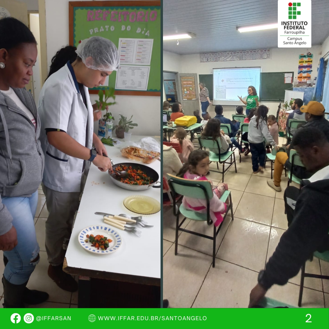 Foram preparados os seguintes pratos: lasanha de peixinho-da-horta, refogado de caruru, cenoura e dente-de-leão e suco de abacaxi, tiririca e ora-pro-nóbis. Os pratos foram muito apreciados por todos que participaram, numa rica e alegre interação entre o IFFar e a comunidade da escola Castellarin - pais, alunos, professores -, assim como os imigrantes que participam do Projeto de Português, nas manhãs de sábado.