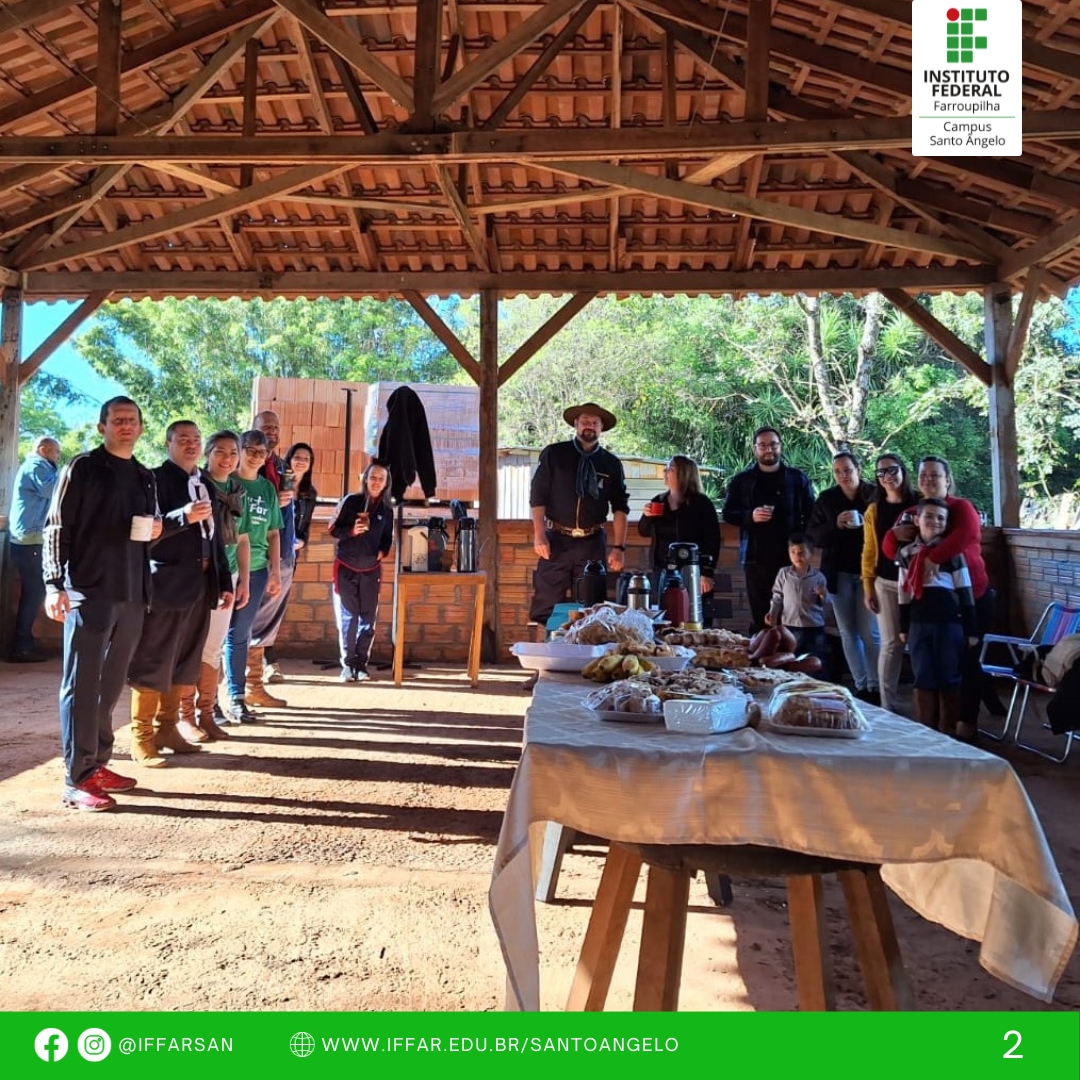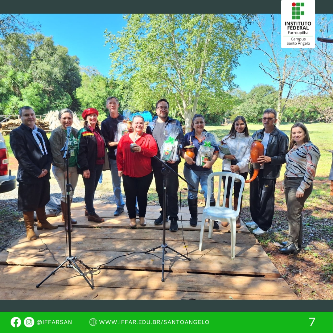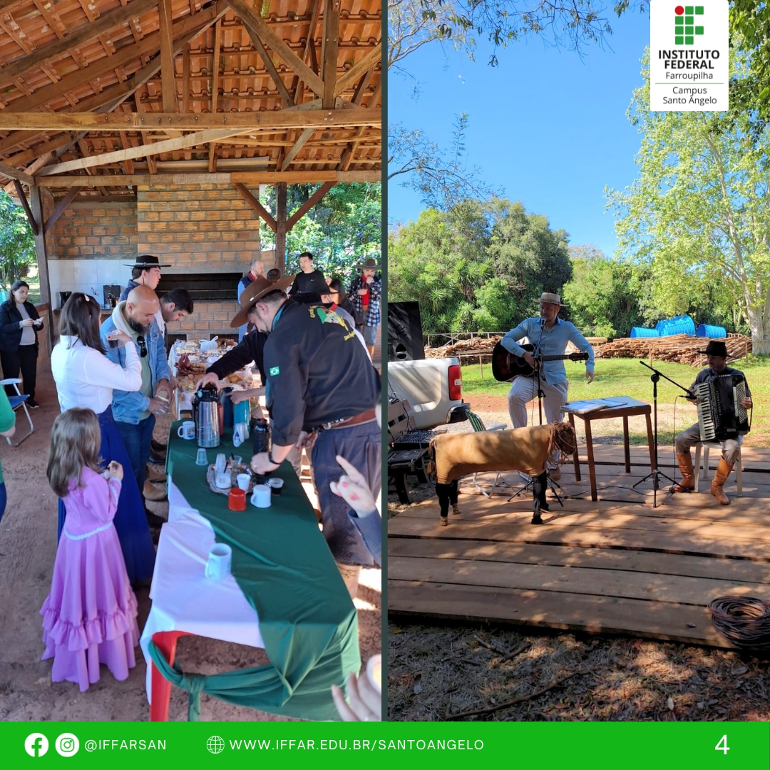 No dia 16/09 o IFFar Campus Santo Ângelo realizou evento alusivo a Semana Farroupilha. Estavam presentes, servidores, estudantes e familiares. Teve café colonial, torneio de truco, concurso de cuias, apresentações artísticas, brincadeira da vaca parada, e muita diversão. Foi uma manhã muito agradável, de integração, confraternização e alusão à tradição gaúcha.