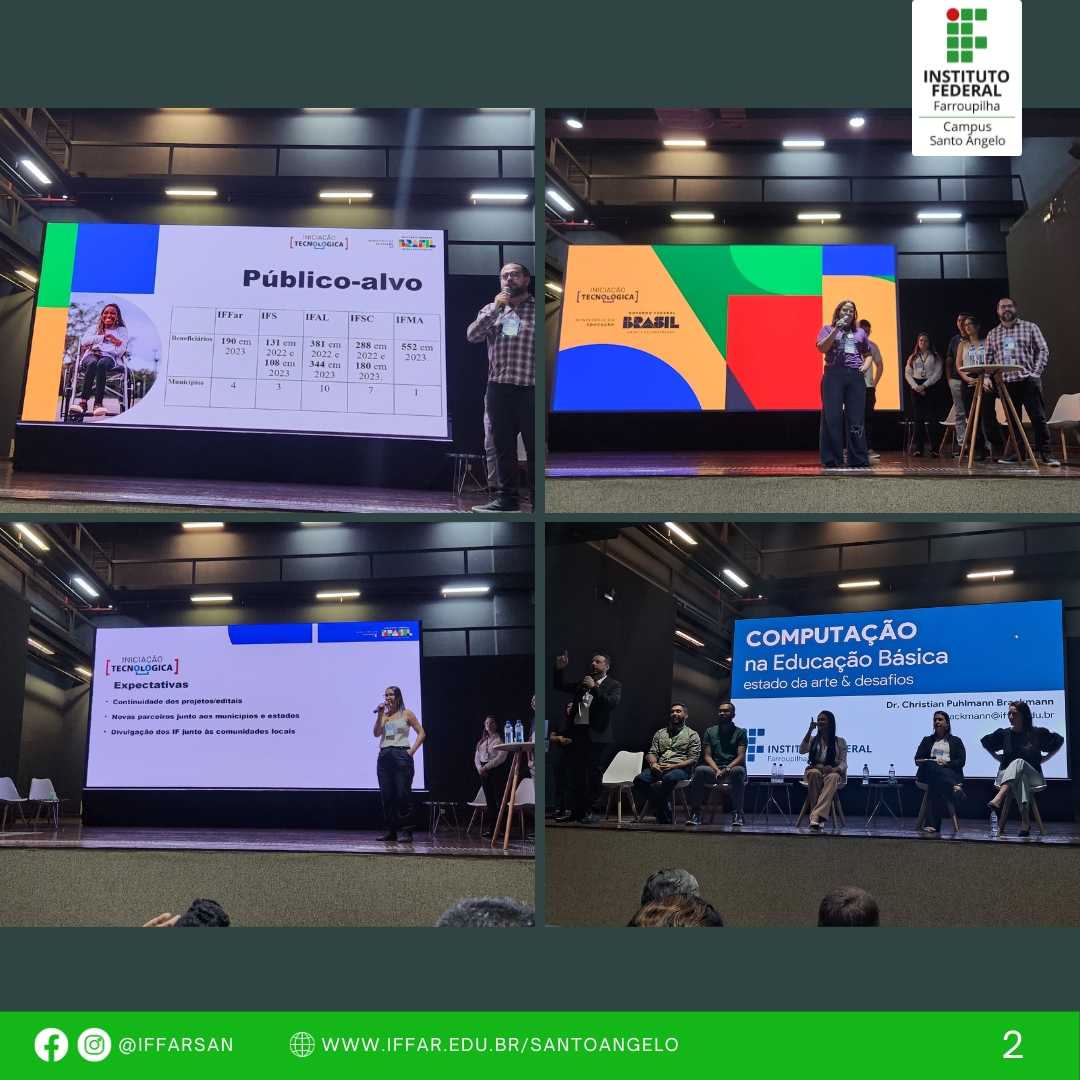 Já a coordenadora dos projetos participou do evento InovEPT, que reuniu todos os projetos fomentados com recurso financeiro pelo Edital 88/2022 da SETEC/MEC, a nível nacional, e através dos grupos de discussão, apresentou os resultados obtidos até o momento com a realização de oficinas sobre a Cultura Maker nas escolas da rede de ensino municipal e estadual, de Santo Ângelo, Entre-Ijuís, Giruá e Vitória das Missões.