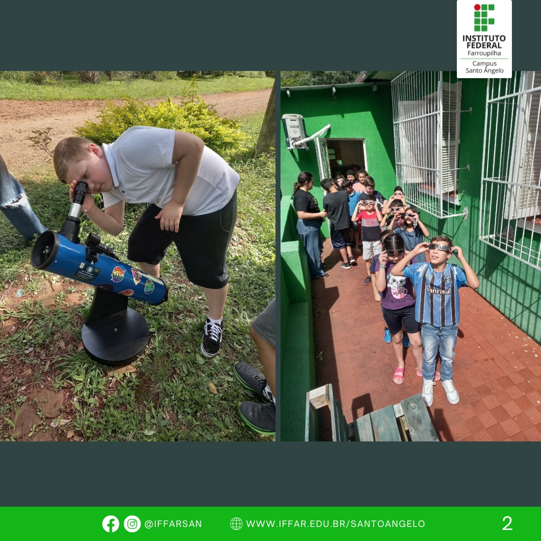 Na tarde de 20 de novembro, a Escola Estadual Ulysses Rodrigues trouxe duas turmas de 3º ano do Ensino Fundamental, com 36 alunos e as professoras Ana Paula e Bianca, para conhecerem o Clube de Astronomia.