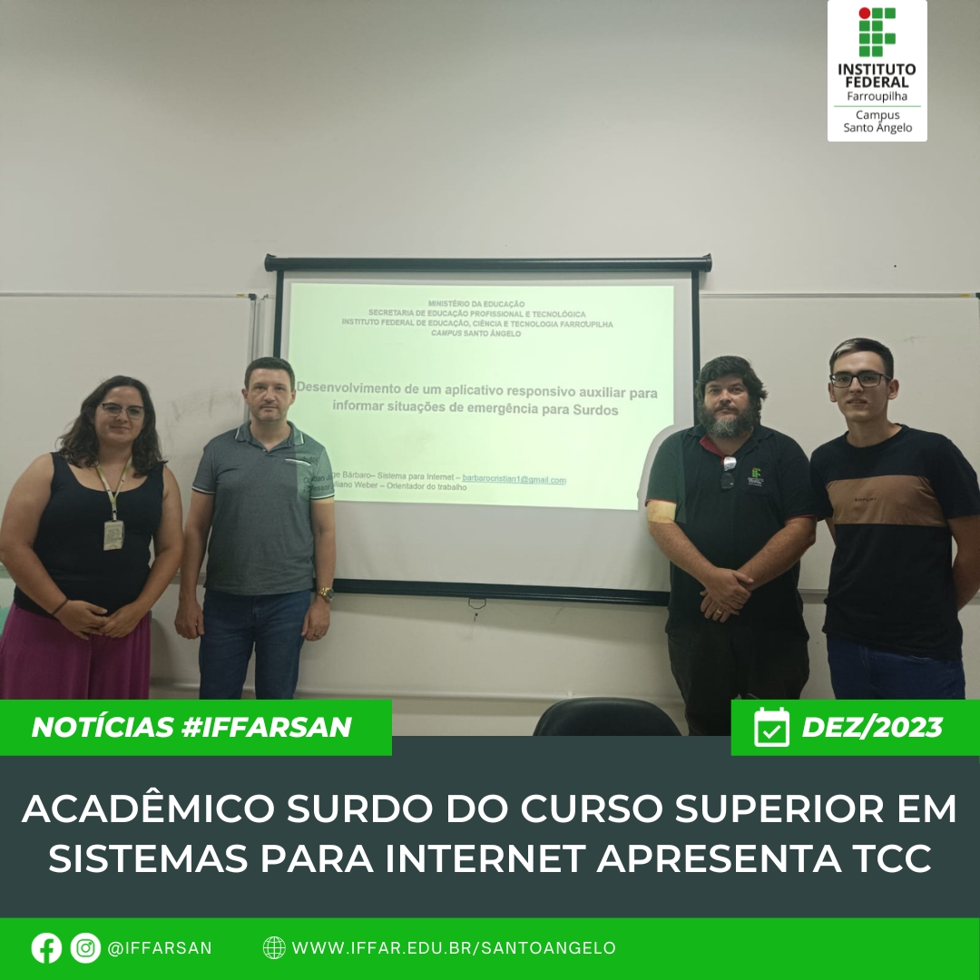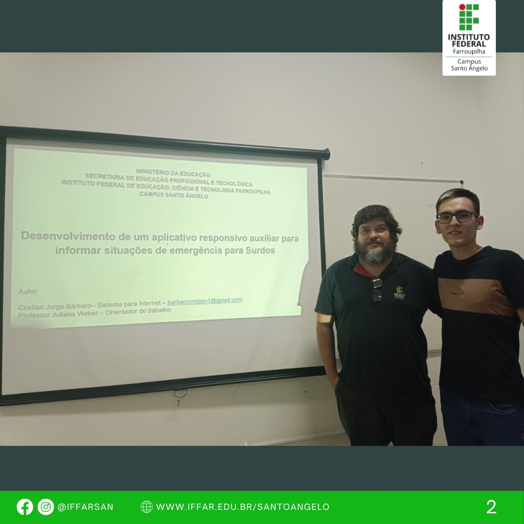 No dia 14 de dezembro, o acadêmico Cristian José Barbaro, apresentou seu trabalho de conclusão de curso, tendo como título Desenvolvimento de um aplicativo responsivo auxiliar para informar situações de emergência para Surdos, tendo como proposito desenvolver um aplicativo para melhorar a acessibilidade da comunidade surda, visando propiciar o acesso ao pedido de socorro para as pessoas Surdas em situações de emergência. O trabalho, contou com a orientação do professor Juliano Weber.