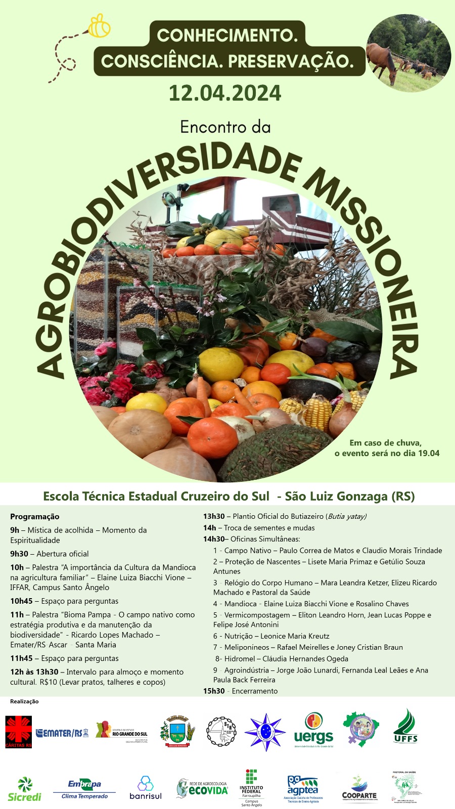 Comitivas vindas de mais de 20 municípios das Missões são aguardadas no Encontro da Agrobiodiversidade Missioneira que, neste ano, acontece em São Luiz Gonzaga, no próximo dia 12 de abril. Oficinas e palestras que contemplam potencialidades e a diversidade da agricultura e da biodiversidade regional estão na programação, aberta ao público, a ser realizada junto à Escola Técnica Estadual Cruzeiro do Sul.