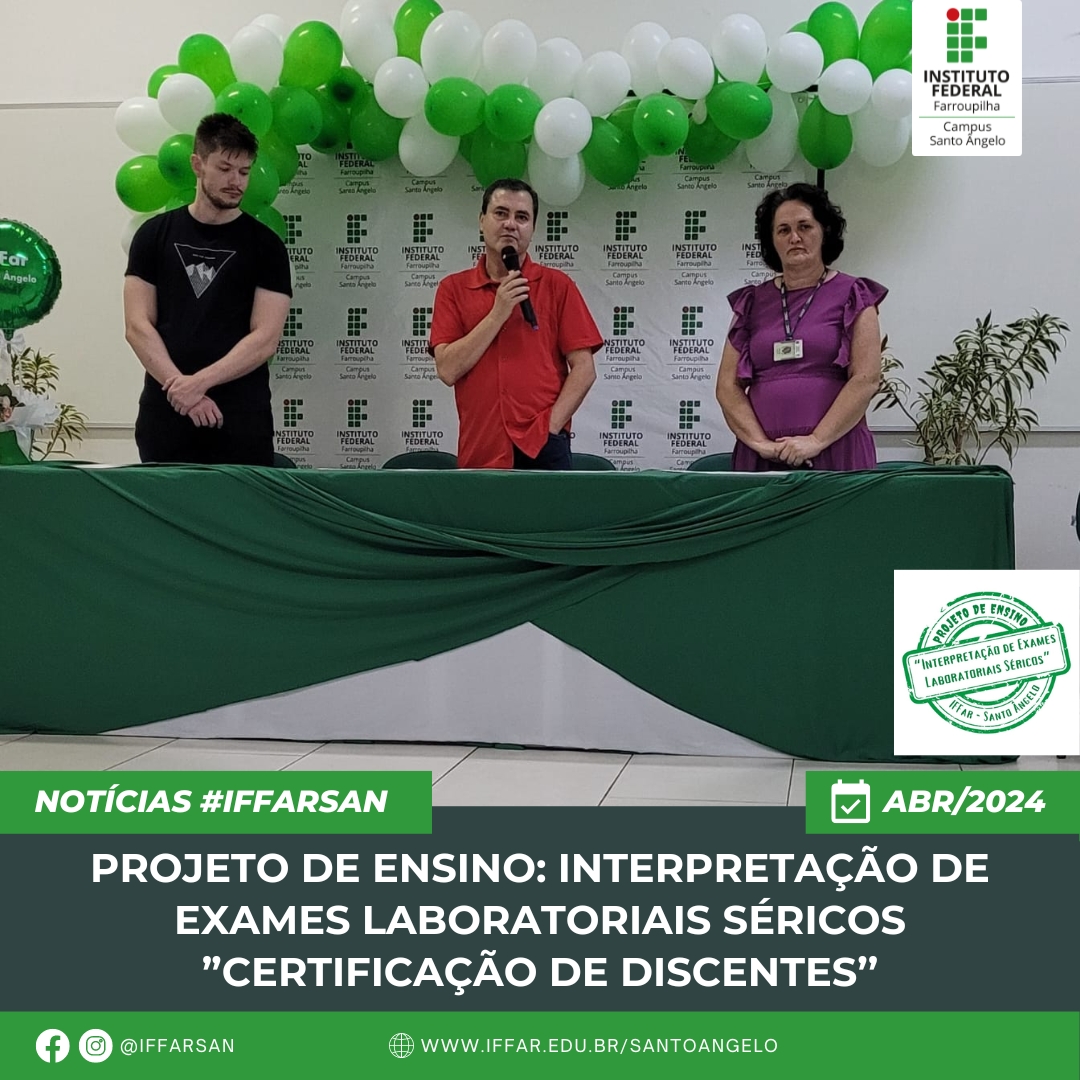 No último dia 05/04/2024 ocorreu à solenidade de entrega dos Certificados aos discentes que concluíram o Projeto de Ensino: “Interpretação de Exames Laboratoriais Séricos”. O evento ocorreu nas dependências do Instituto Federal Farroupilha – Campus Santo Ângelo. Participaram do Projeto alunos em formação do Curso Técnico em Enfermagem e quinze (15) educandos receberam a certificação.