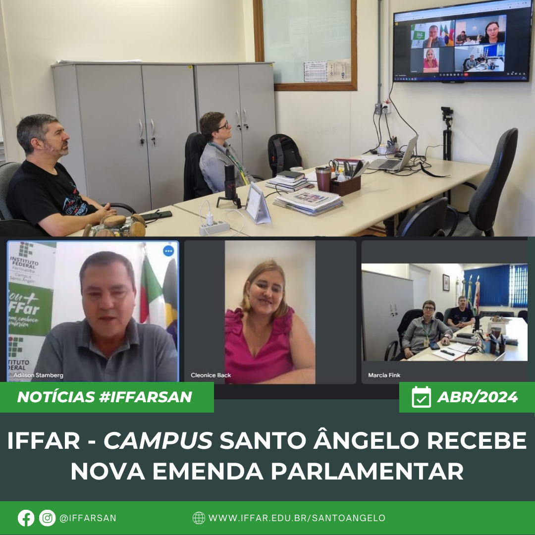 A partir de uma agenda compartilhada de interlocução entre a Gestão do Campus Santo Ângelo e do Campus Santo Augusto com a Suplente do Senador Paulo Paim (PT/RS), Cleonice Back, realizada em meados de 2023, objetivando solicitação de recursos extraorçamentários de emenda parlamentar, no dia 11 de março de 2024, em reunião remota realizada pela plataforma Google Meet, confirmou-se a indicação/destinação de Emenda de Bancada ao Orçamento Geral da União de 2024, do Sen. Paulo Paim, no valor de R$ 100.000.00 (cem mil reais) para ambas unidades do IFFar. Estiveram presentes na reunião, além das Direções dos Campi, a Reitora do IFFar, Prof. Nídia Heringer e o Pró-Reitor de Desenvolvimento Institucional, Prof. Carlos Lehn.