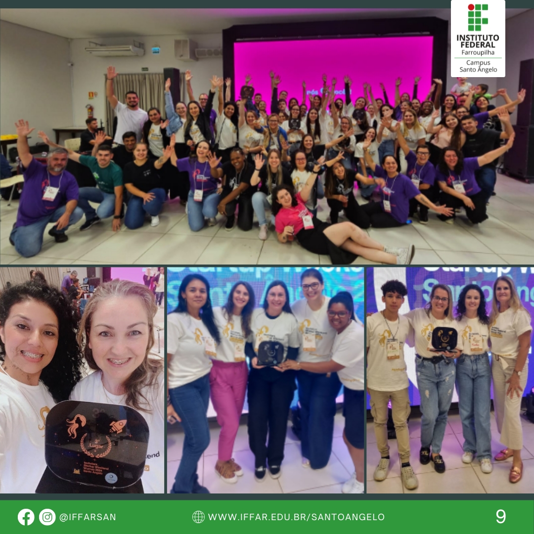 E para finalizar, um Startup Weekend voltado para mulheres foi realizado entre os dias 19 e 21 de abril. Contando com a participação de discentes do campus: Marlize Sanchotene Bachinski Duarte e Kelen Aline Ribeiro Da Silva, do curso de Licenciatura em Computação. E a Larissa Maciel Paulus e o Fernando Dorneles Da Silva, do curso Técnico em Informática.