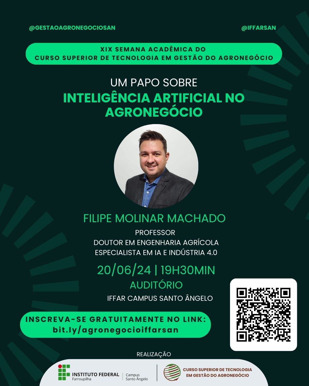 Dia 20/06/24 às 19h30min: Palestra "Inteligência Artificial no Agronegócio" com Dr. Filipe Molinar Machado (Professor, Doutor em Engenharia Agrícola, Especialista em IA e Indústria 4.0).