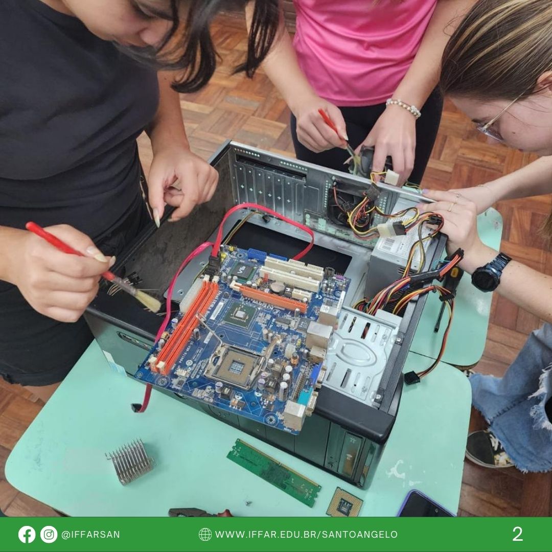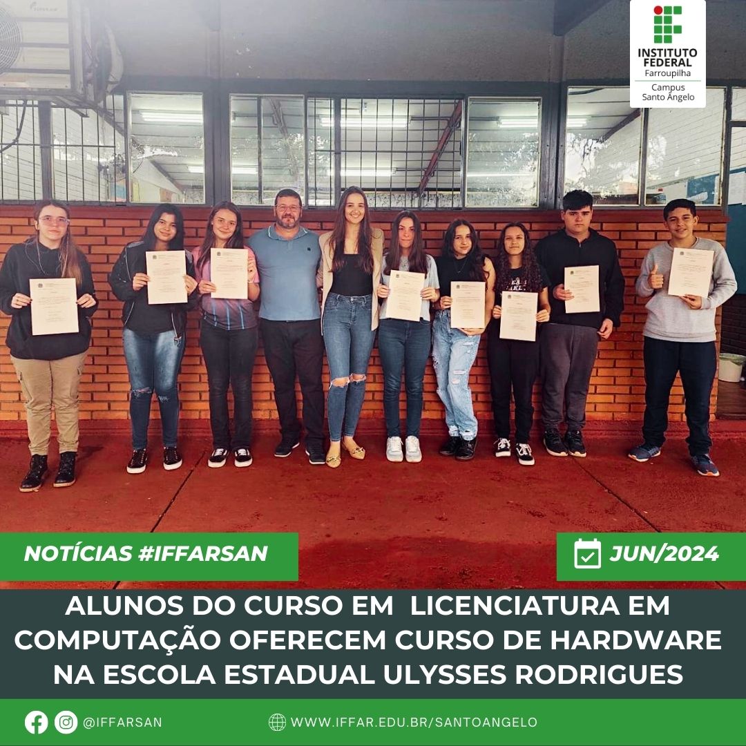 Os estudantes do curso de Licenciatura em Computação do IFFar - Campus Santo Ângelo, Camilla Luisa Rustick Fanzlau e Leandro Ventura Farias, organizaram um curso de hardware denominado "Conhecendo Computadores: Uma Imersão na Introdução de Hardware" para os alunos do nono ano da Escola Estadual de Ensino Fundamental Ulysses Rodrigues, em Santo Ângelo.