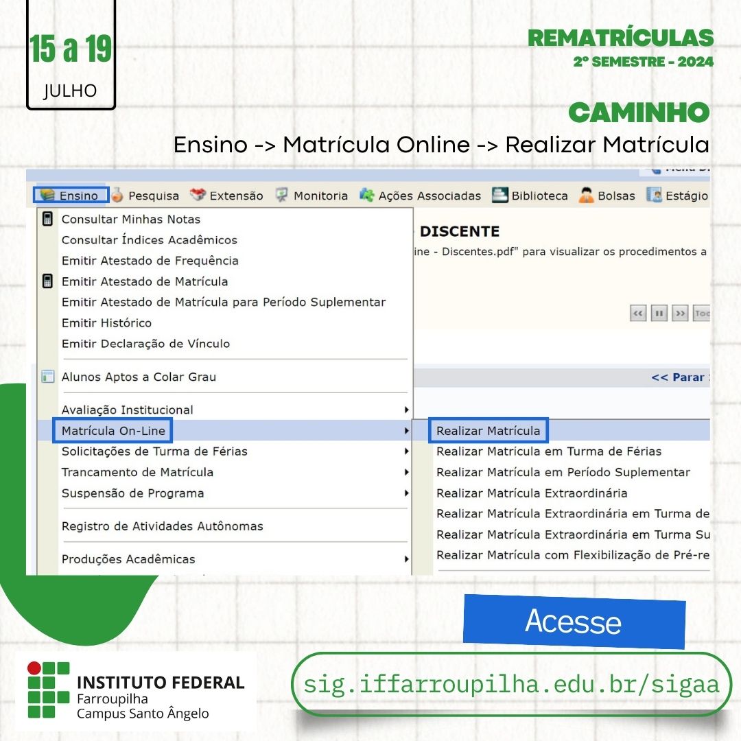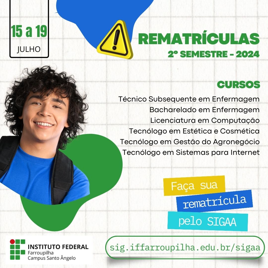 O IFFar - Campus Santo Ângelo informa que o período de rematrícula online para o ano de 2024 acontecerá de 15 a 19 de julho de 2024. Os cursos contemplados neste período são: