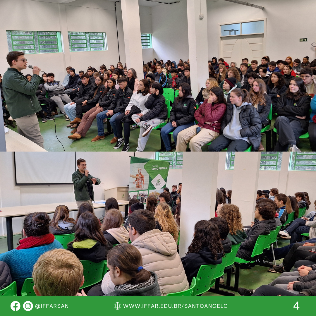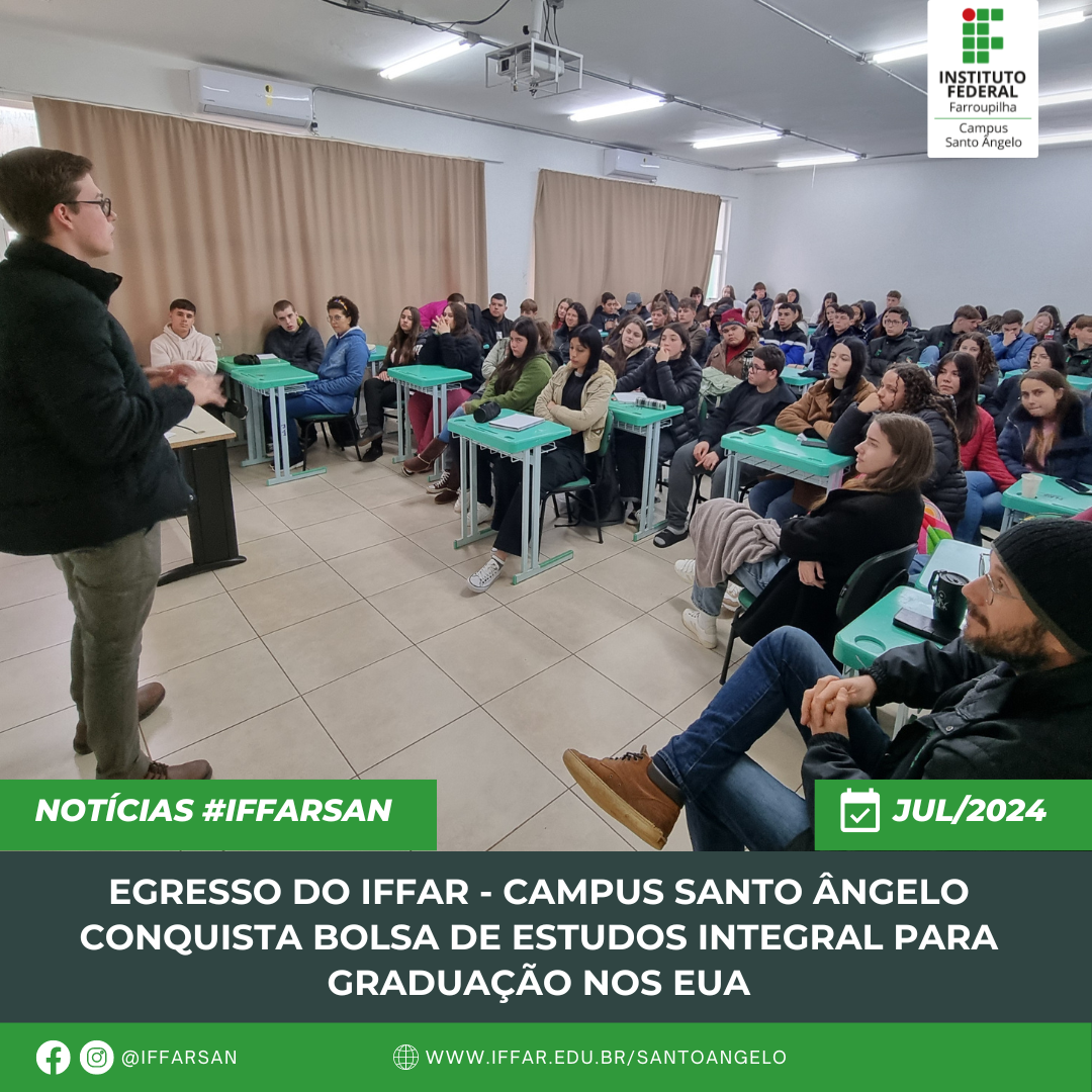 Nas manhãs dos dias 09 e 11 de julho de 2024, José Frederico compartilhou a sua trajetória exitosa, com estudantes dos Cursos Técnicos Integrados em Administração, Agricultura, Informática e servidores no IFFar-SAN. O egresso valorizou a importância de ter sido aluno do IFFar para seu sucesso no processo seletivo do exterior e falou da importância em aproveitar todas as oportunidades que a instituição proporciona, além do ensino qualificado, também a participação em projetos de ensino, pesquisa e extensão, como diferencial no seu currículo.