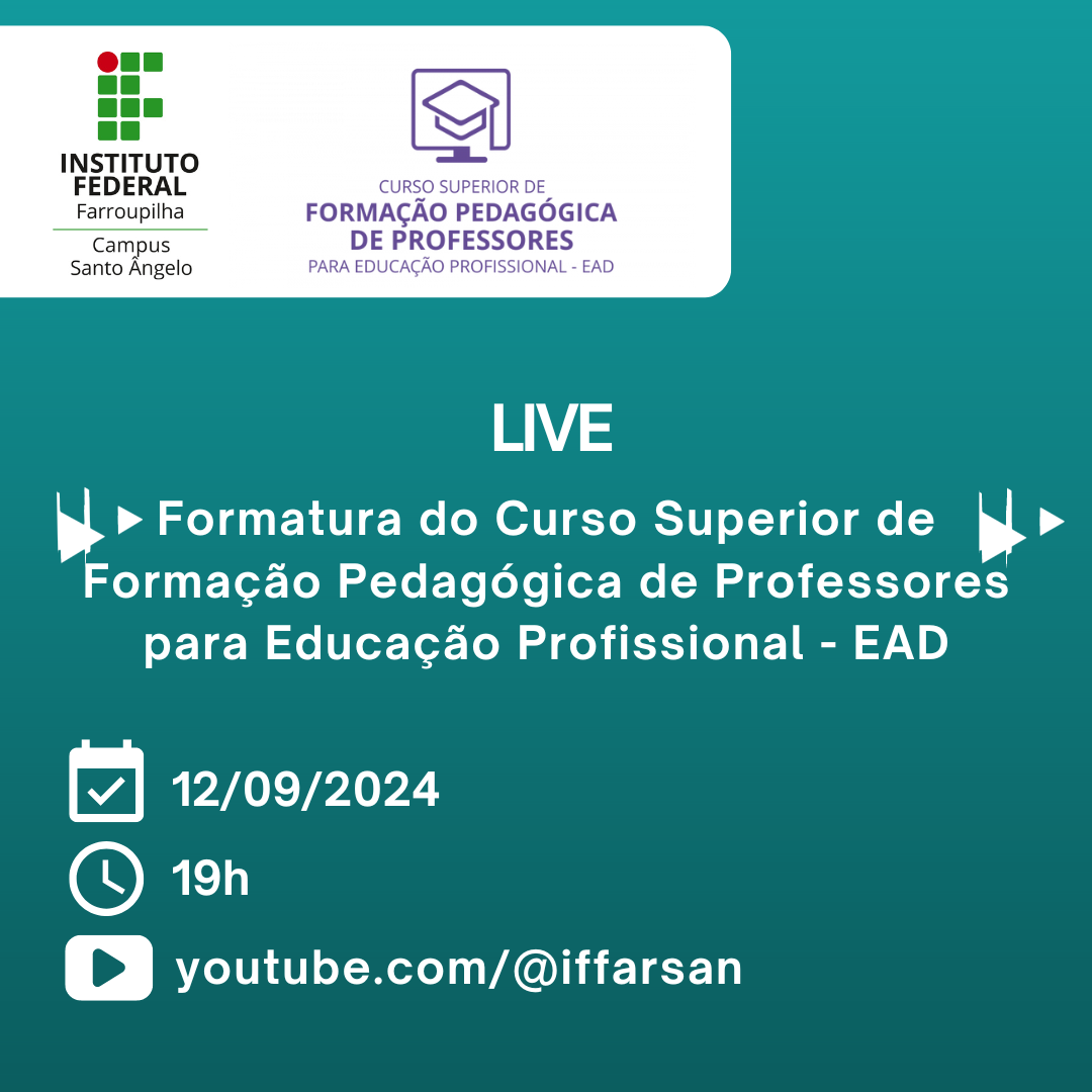 Hoje, 12/09, às 19 horas, será realizada a solenidade de formatura do Curso Superior em Formação Pedagógica de Professores para a Educação Profissional - EAD, por webconferência.
