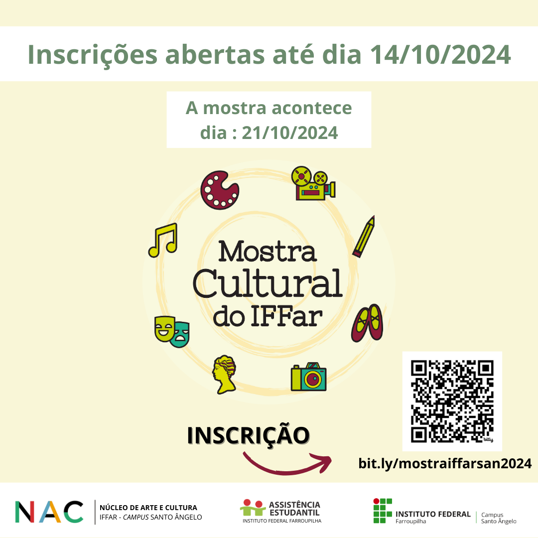 As inscrições poderão ser feitas até o dia 14 de outubro de 2024 nas modalidades de apresentações artístico-culturais, exposições e produção audiovisual através do formulário, link: https://bit.ly/mostraiffarsan2024 ???