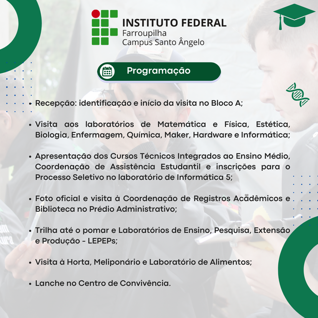 No dia 08/10, a partir das 8h, o IFFar-SAN te espera para uma visita guiada aos laboratórios e setores da instituição, com apresentação dos Cursos Técnicos Integrados ao Ensino Médio, projetos e apoio para inscrição no Processo Seletivo 2024.