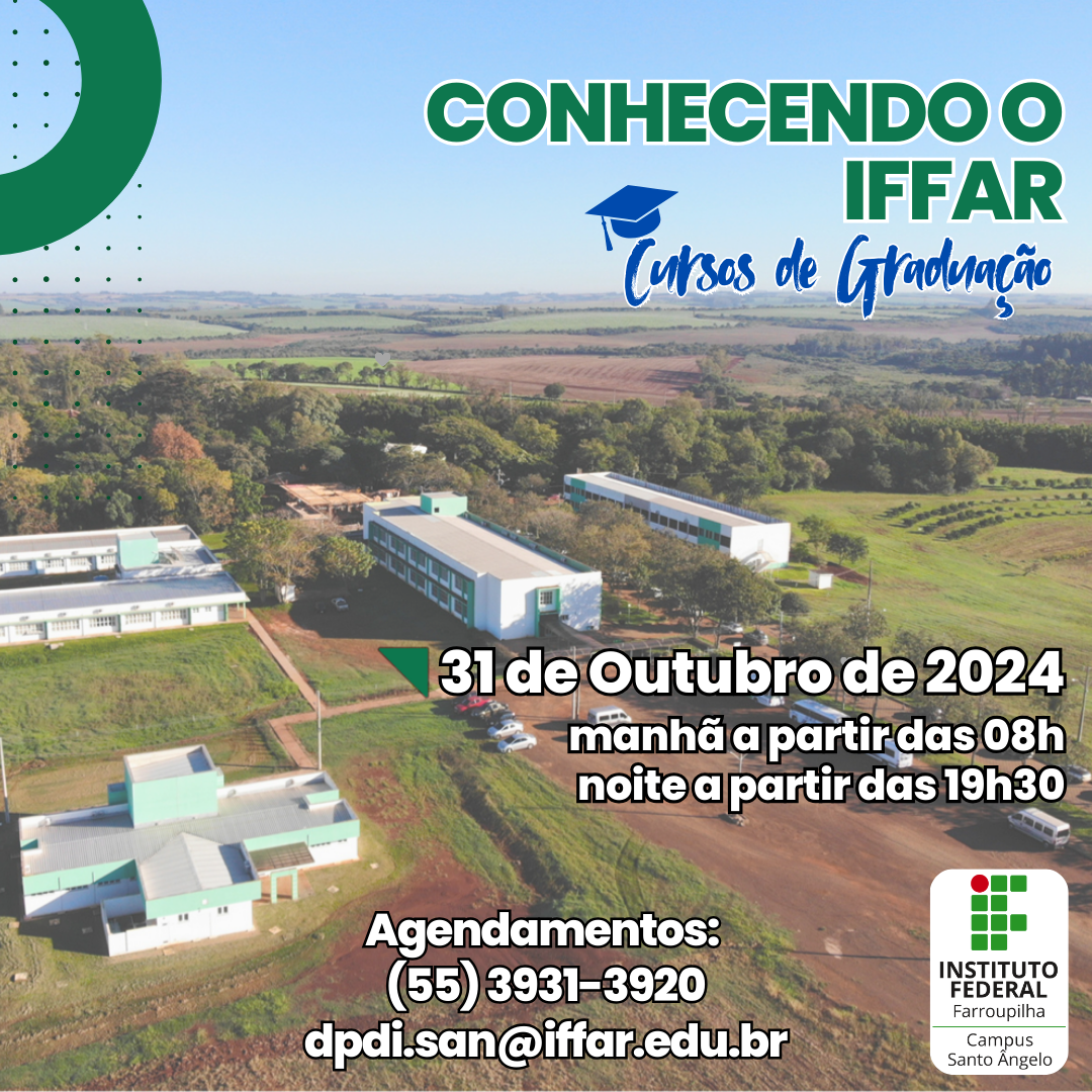 No dia 31/10, pela manhã a partir das 8h e à noite às 19h30, o IFFar-SAN te espera para uma visita guiada aos laboratórios e setores da instituição, com apresentação dos Cursos de Graduação, projetos e apoio para inscrição no Processo Seletivo 2024.