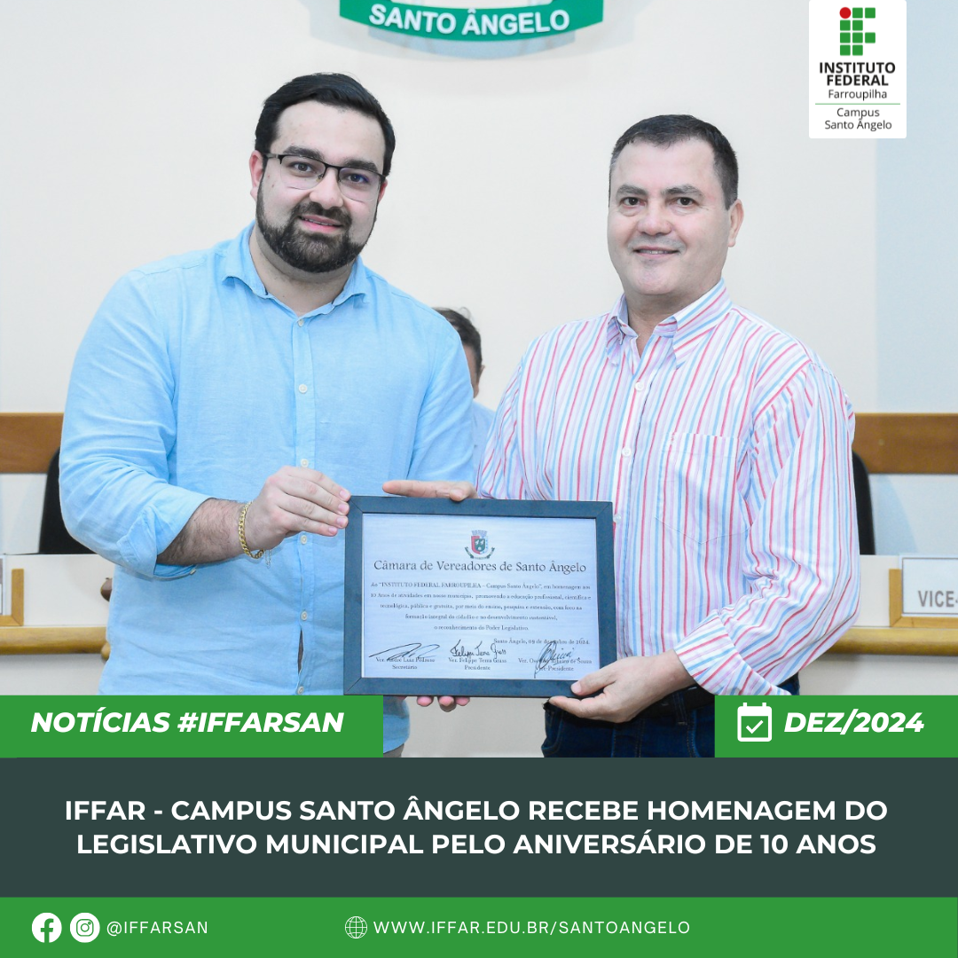 Na sessão ordinária da Câmara de Vereadores do dia 09 de dezembro de 2024 o Instituto Federal Farroupilha - Campus Santo Ângelo (IFFar-SAn), recebeu homenagem de reconhecimento aos 10 (dez) anos de atuação junto à comunidade local e regional, promovendo a educação profissional, científica e tecnológica, pública e gratuita, por meio do ensino, pesquisa e extensão, com foco na formação integral do cidadão e no desenvolvimento sustentável.