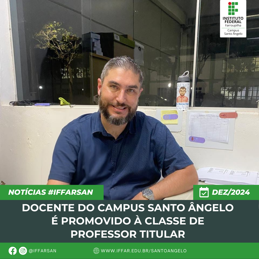 Conforme Portaria Eletrônica nº 1296/GRE, de 22 de novembro de 2024, o Professor do IFFar - Campus Santo Ângelo, Dr. Vinícius Feltrin Giglio, obteve Promoção à Classe de Professor Titular, última classe da Carreira de Magistério do Ensino Básico, Técnico e Tecnológico (EBTT), após aprovação pela Comissão Especial de Avaliação.