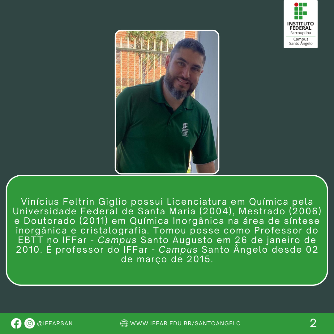Vinícius Feltrin Giglio possui Licenciatura em Química pela Universidade Federal de Santa Maria (2004), Mestrado (2006) e Doutorado (2011) em Química Inorgânica na área de síntese inorgânica e cristalografia. Tomou posse como Professor do EBTT no IFFar - Campus Santo Augusto em 26 de janeiro de 2010. É professor do IFFar - Campus Santo Ângelo desde 02 de março de 2015.