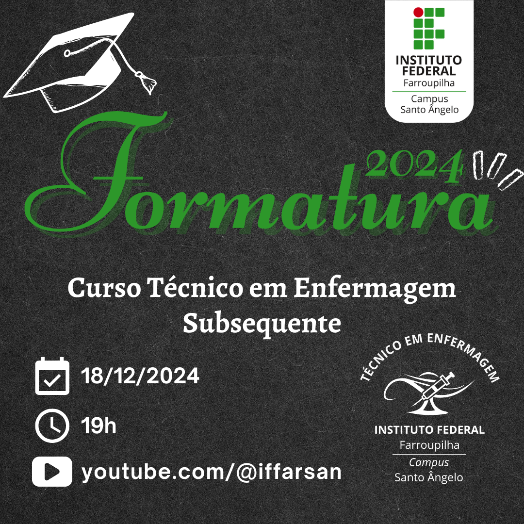 O IFFar - Campus Santo Ângelo convida toda a comunidade para prestigiar a cerimônia de formatura do Curso Técnico em Enfermagem - Subsequente, que ocorrerá no dia 18 de dezembro de 2024, às 19h, com transmissão ao vivo pelo nosso canal oficial no YouTube: youtube.com/@iffarsan.