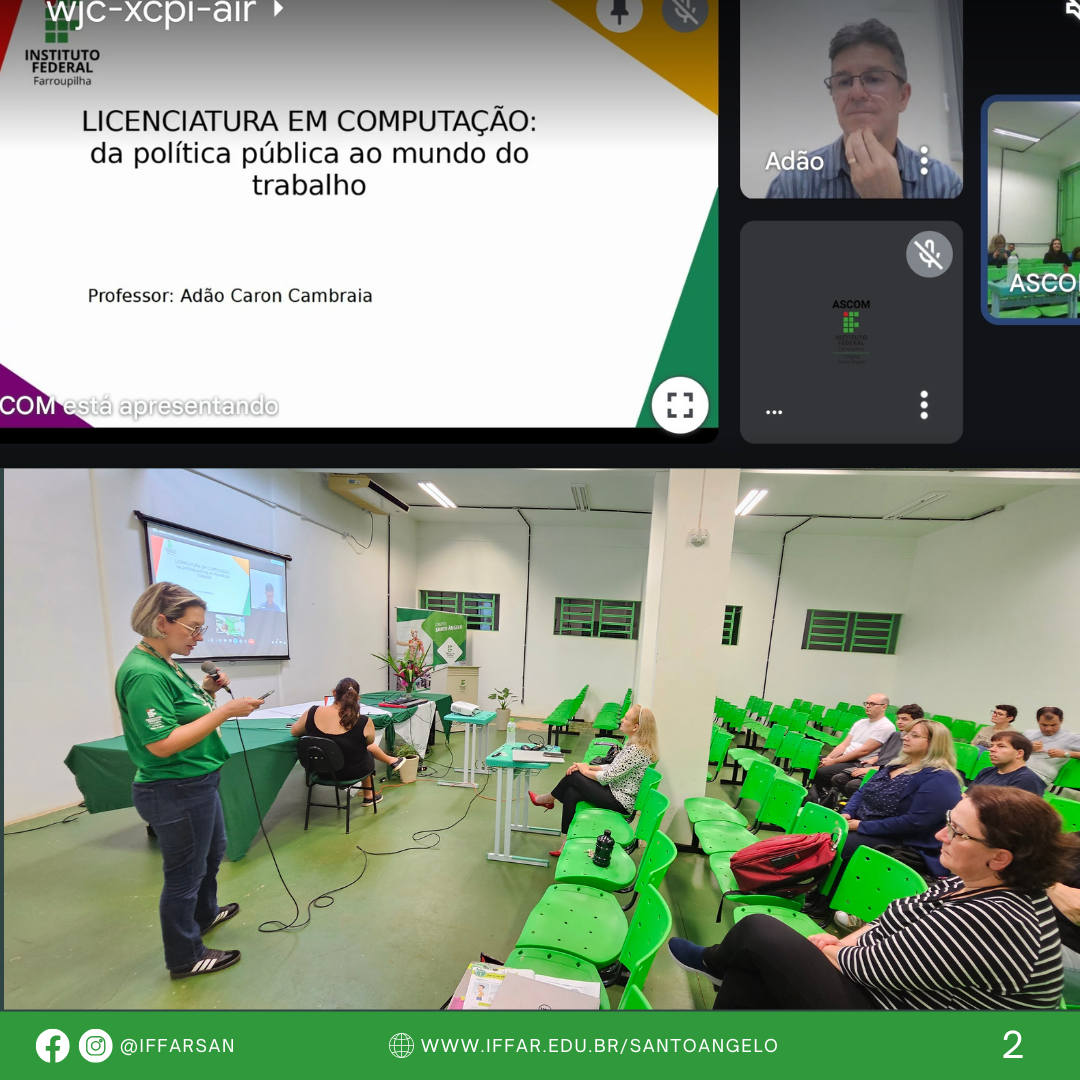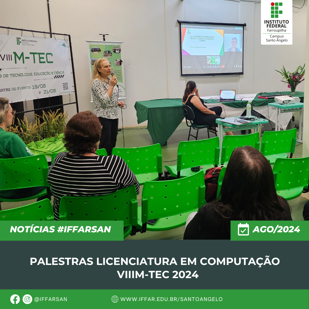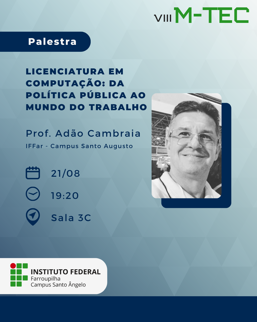 Durante a VII M-TEC 2024 foi realizada a palestra: Licenciatura em Computação: da política pública ao mundo do trabalho,ministrada pelo professor Adão Cambraia do IFFar - Campus Santo Augusto.