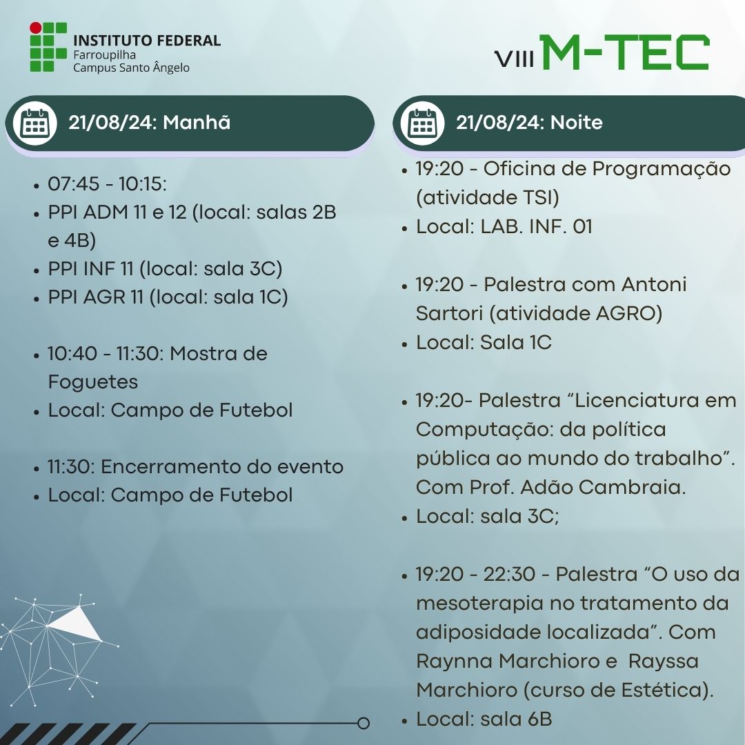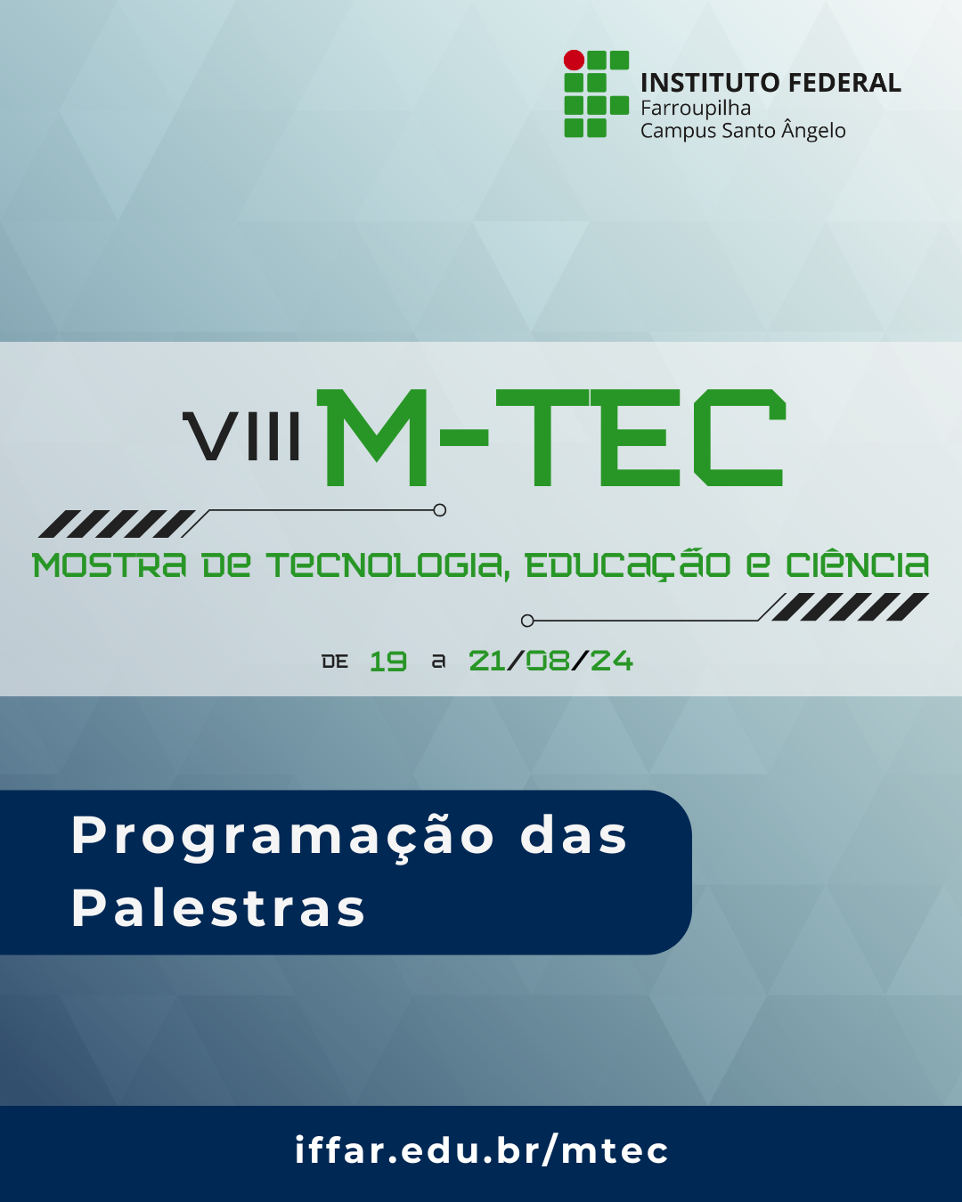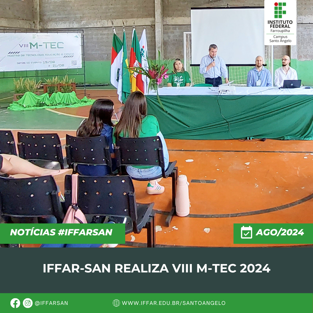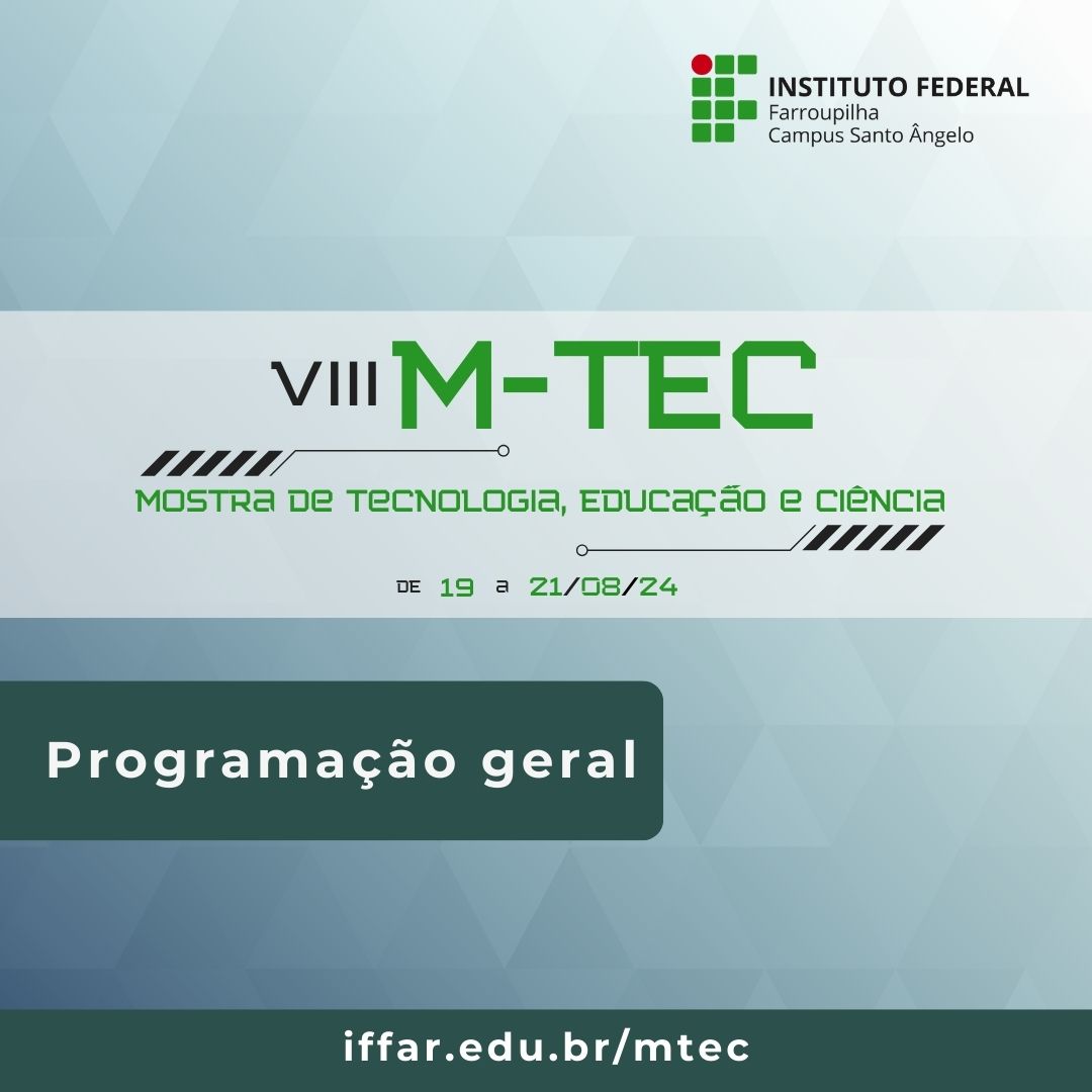 O IFFar - Campus Santo Ângelo realizou a VIII M-Tec entre os dias 19 a 23 de agosto de 2024 nas dependências da instituição. O evento contou com uma programação completa para todos os cursos.
