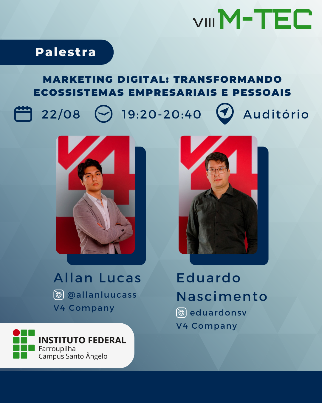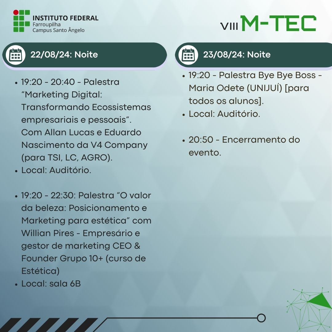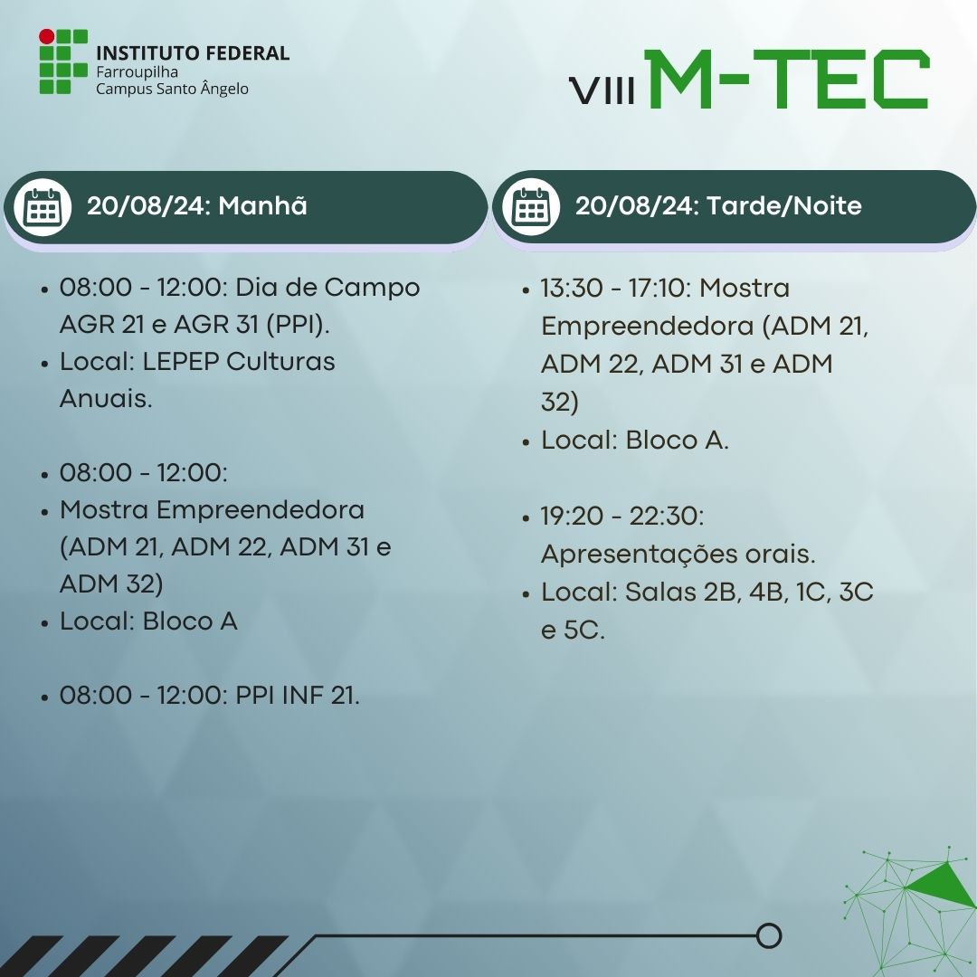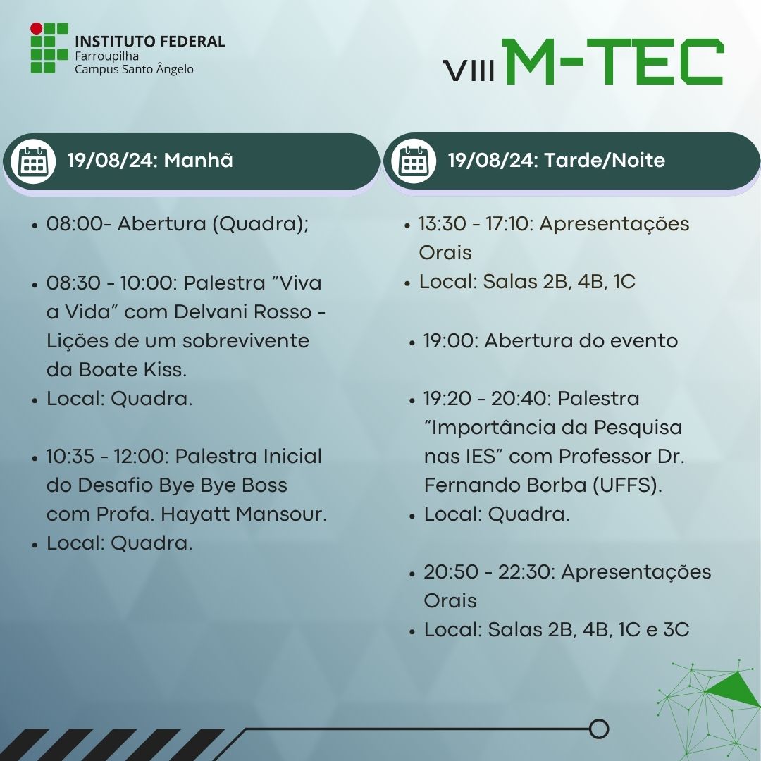 O IFFar - Campus Santo Ângelo realizou a VIII M-Tec entre os dias 19 a 23 de agosto de 2024 nas dependências da instituição. O evento contou com uma programação completa para todos os cursos.