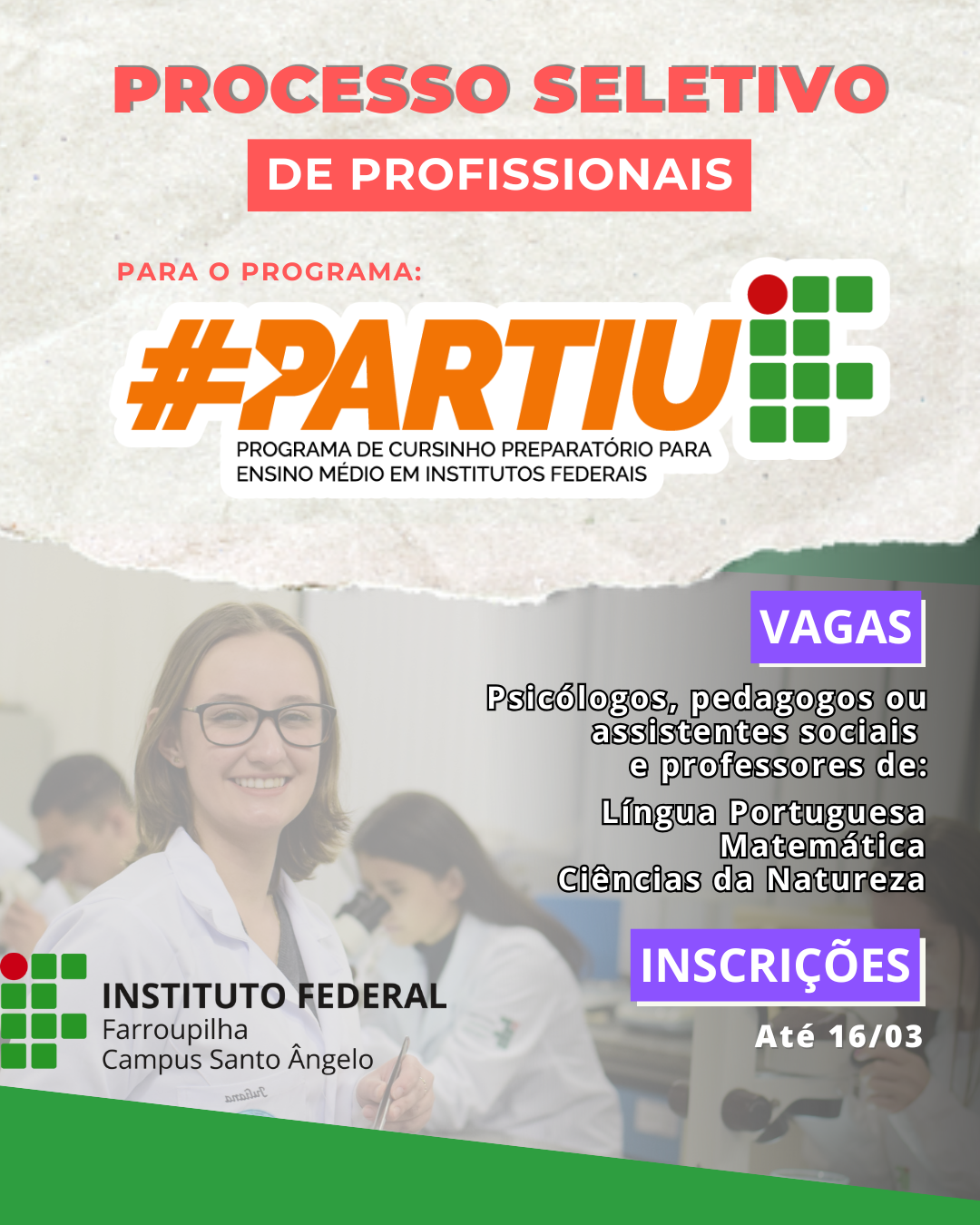 O Instituto Federal Farroupilha (IFFar), em parceria com a FAIFSUL, está com inscrições abertas até 16 de março de 2025 para profissionais da educação que desejam atuar no programa Partiu IF. O programa visa apoiar a recuperação de aprendizagens de estudantes do 9º ano em vulnerabilidade social, oferecendo aulas e atividades de reforço em Língua Portuguesa, Matemática e Ciências da Natureza, além de acompanhamento psicopedagógico.