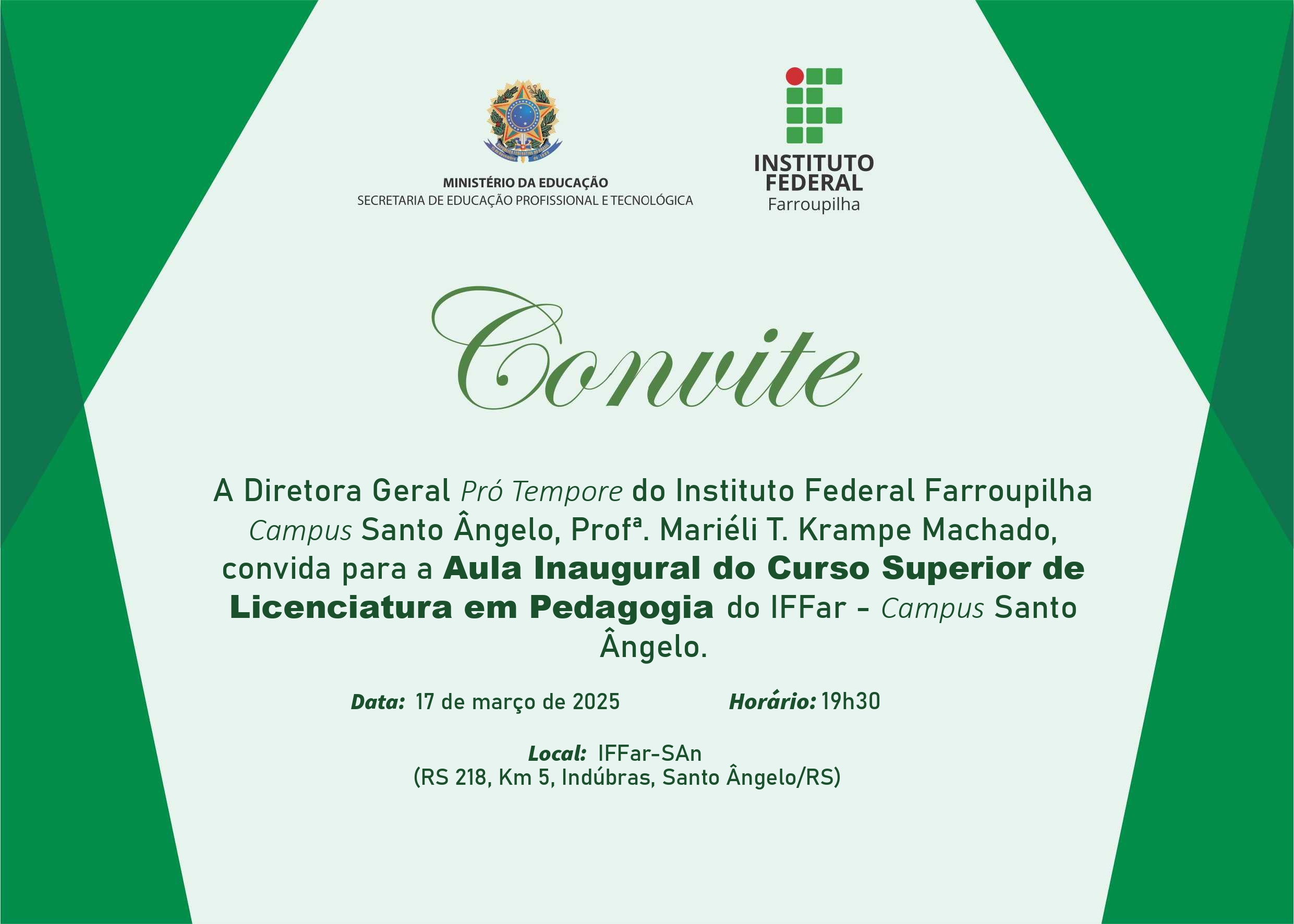 A Diretora Geral Pró Tempore do Instituto Federal Farroupilha Campus Santo Ângelo, Profª. Mariéli T. Krampe Machado, convida para a Aula Inaugural do Curso Superior de Licenciatura em Pedagogia do IFFar - Campus Santo Ângelo.
