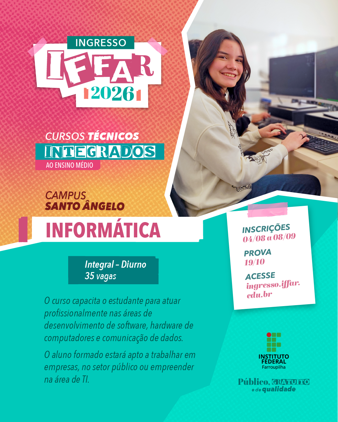O Campus Santo Ângelo oferta 140 vagas nos cursos técnicos de Administração, Agropecuária e Informática.