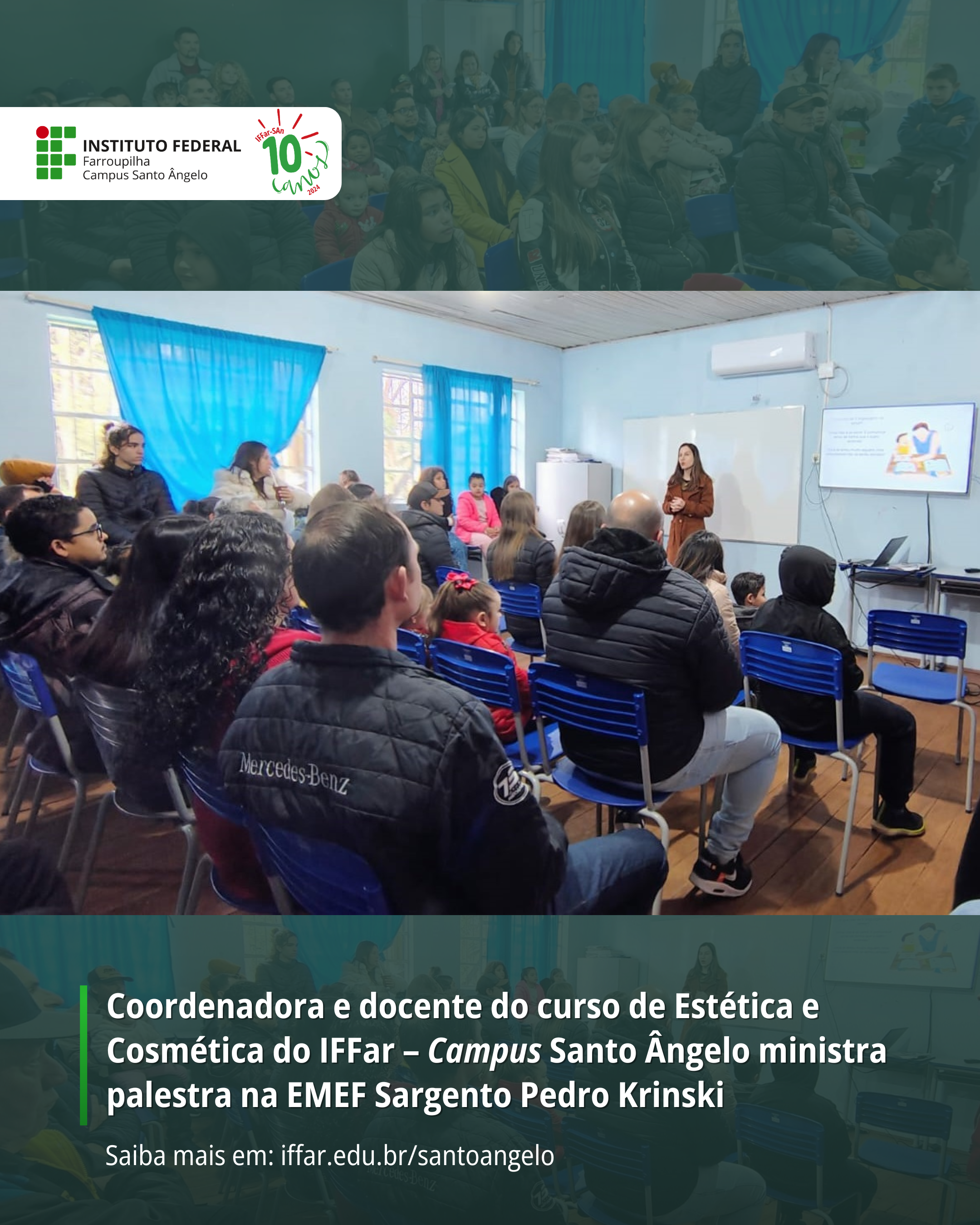 No dia 09 de agosto de 2025, a Dra. Zípora Morgana, coordenadora e docente do curso de Estética e Cosmética do IFFar – Campus Santo Ângelo, ministrou uma palestra para pais e responsáveis na Escola Municipal de Ensino Fundamental (EMEF) Sargento Pedro Krinski.