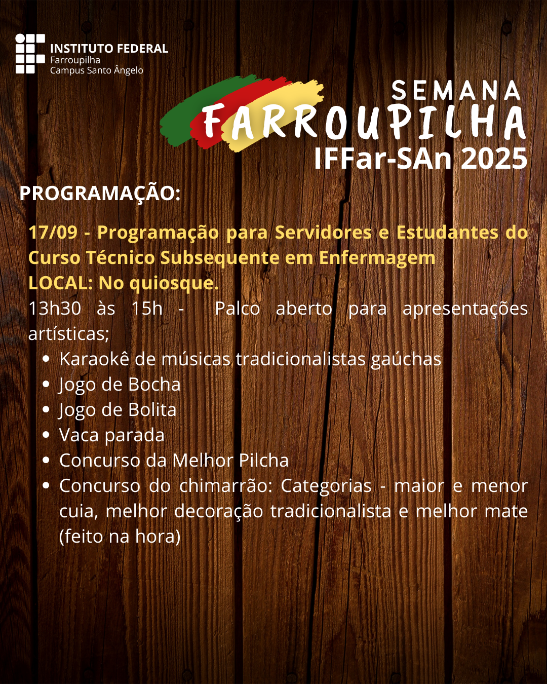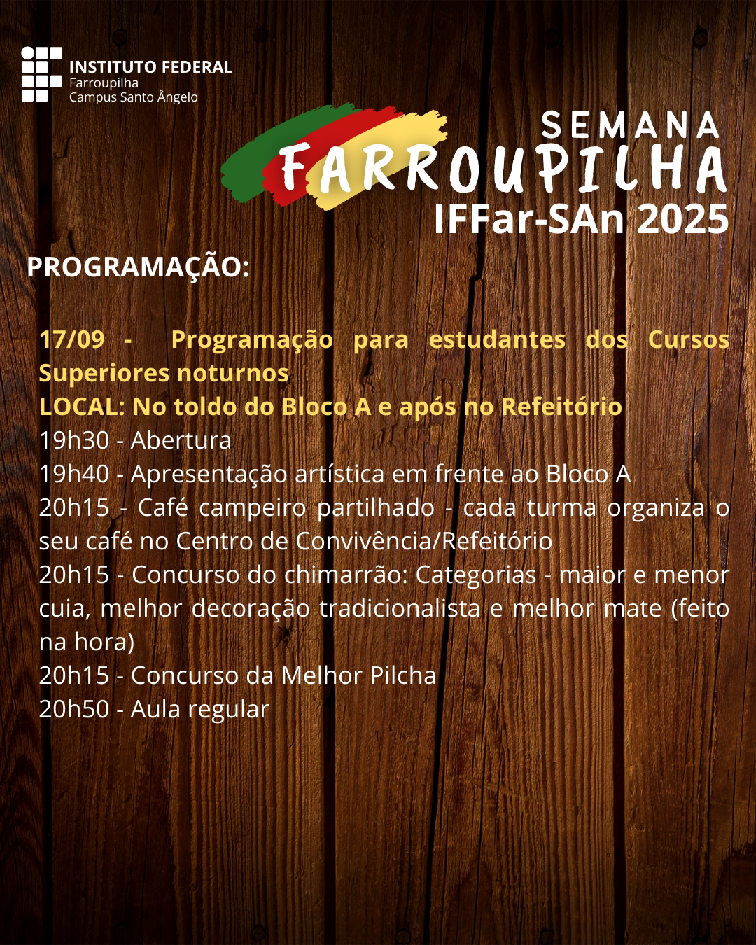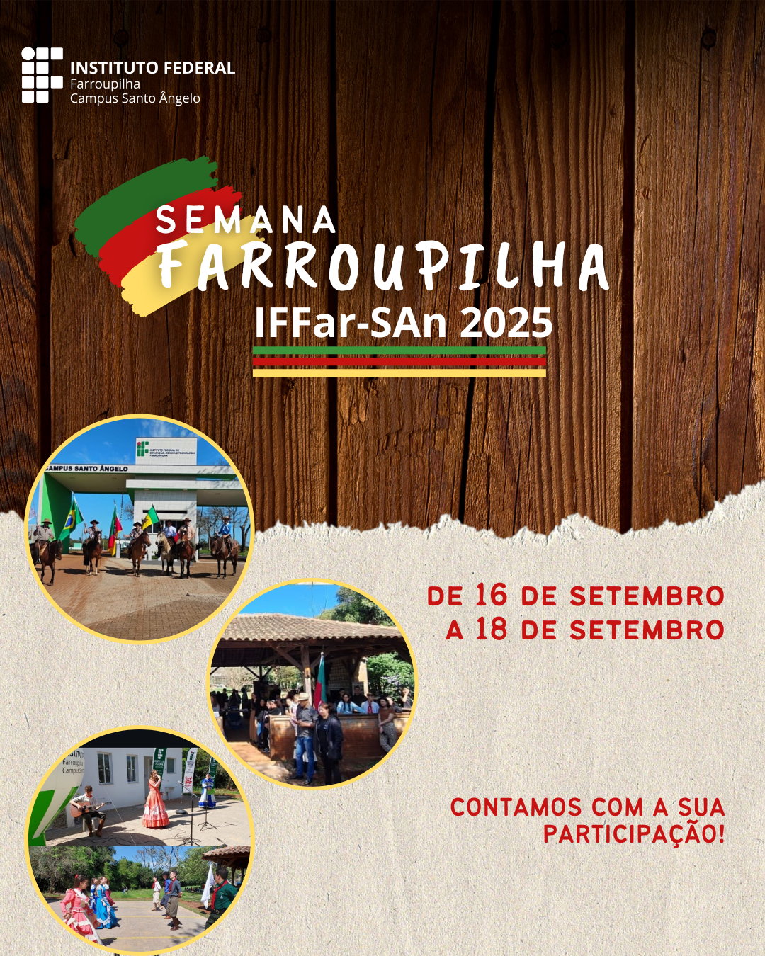 O Instituto Federal Farroupilha – Campus Santo Ângelo convida estudantes, servidores e comunidade acadêmica para participar das atividades da Semana Farroupilha 2025, que ocorrerão nas dependências do campus.
