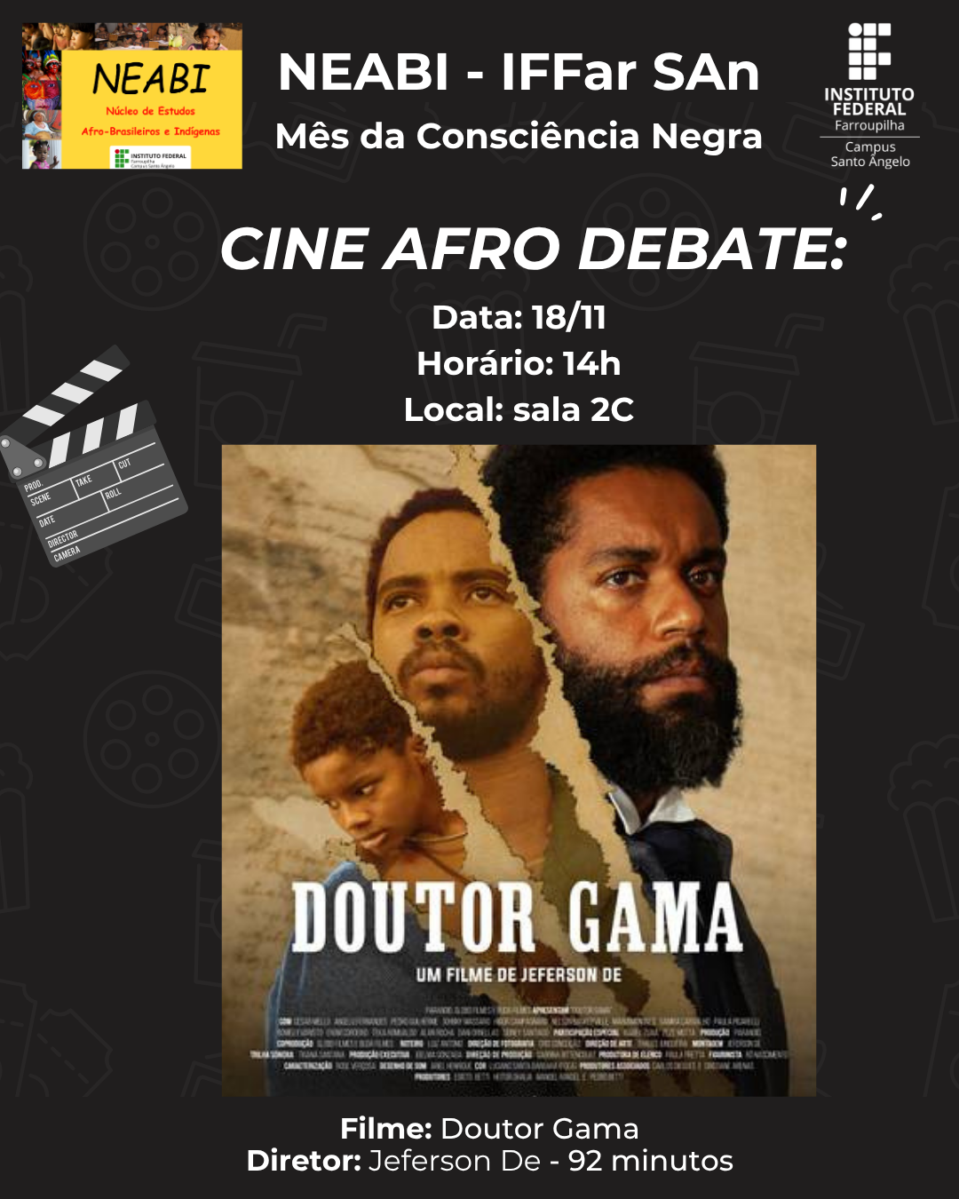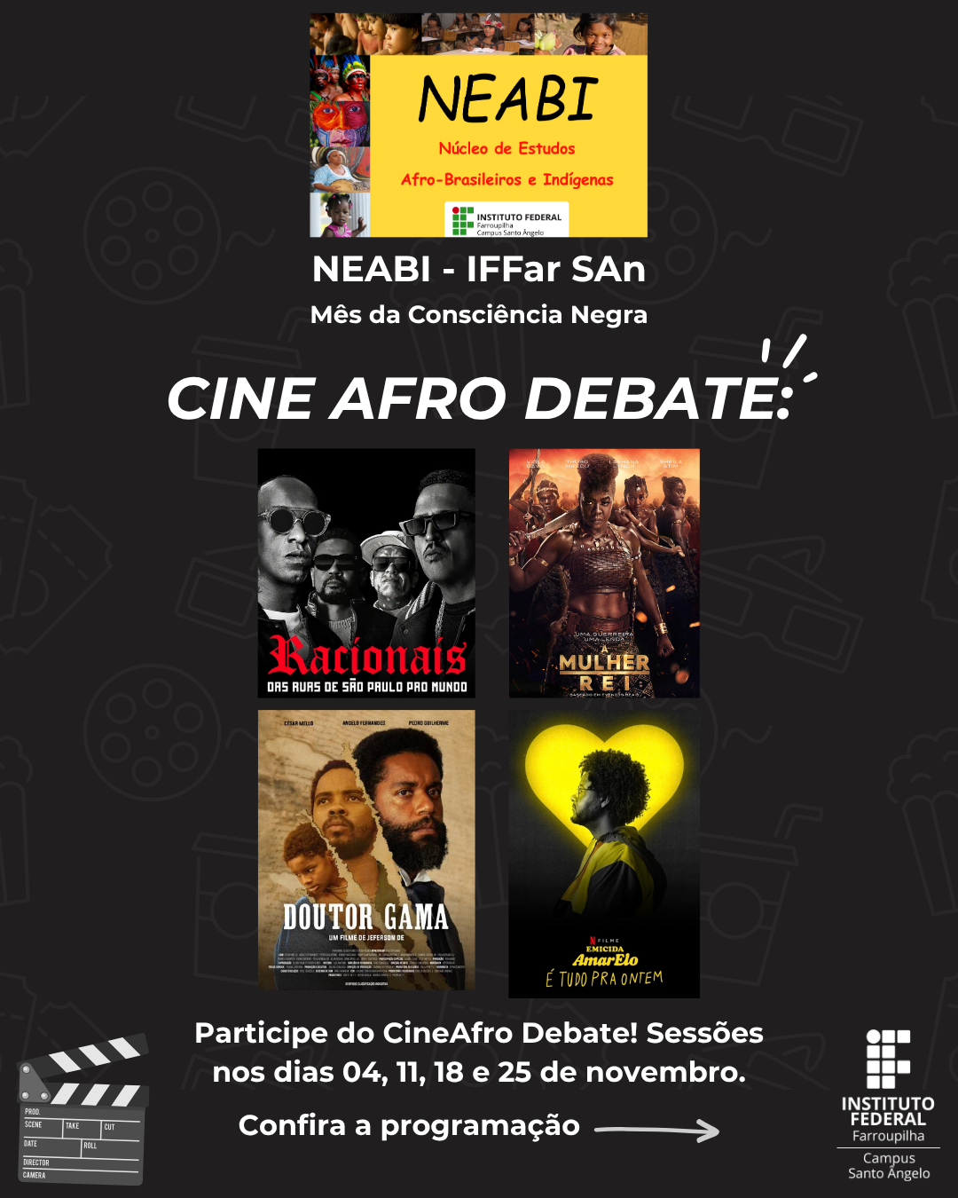 Em celebração ao Mês da Consciência Negra, o NEABI – Núcleo de Estudos Afro-Brasileiros e Indígenas convida toda a comunidade acadêmica para participar do CineAfro Debate, um ciclo de exibições e conversas sobre obras que retratam a cultura, a resistência e as lutas do povo negro.